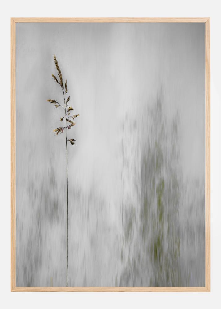 Měkký plakát s jedním klasem trávy na měkkém šedém pozadí. Zlatavě žlutý klas jasně vyniká proti měkkému zaostření v pozadí, které přitahuje pohled. Zavěste obraz na neutrální stěnu v domě pro dotek kouzla pomocí tohoto jednoduchého díla.