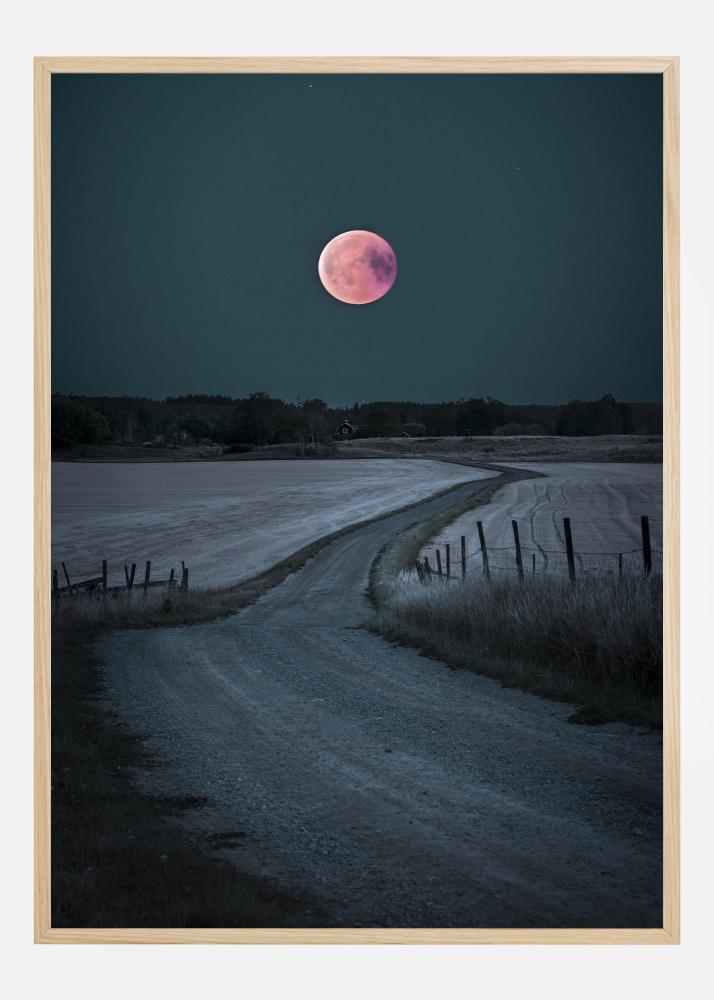 Úžasný plakát se zasněženou krajinou a jasně červeným krvavým měsícem uprostřed. Cesta vede daleko do dálky a přitahuje pohled k měsíci, který stojí nízko na obloze. Šedá a modrá kontrastují s červenou a růžovou měsíce, aby vytvořily pocit úcty v tomto nočním obraze.