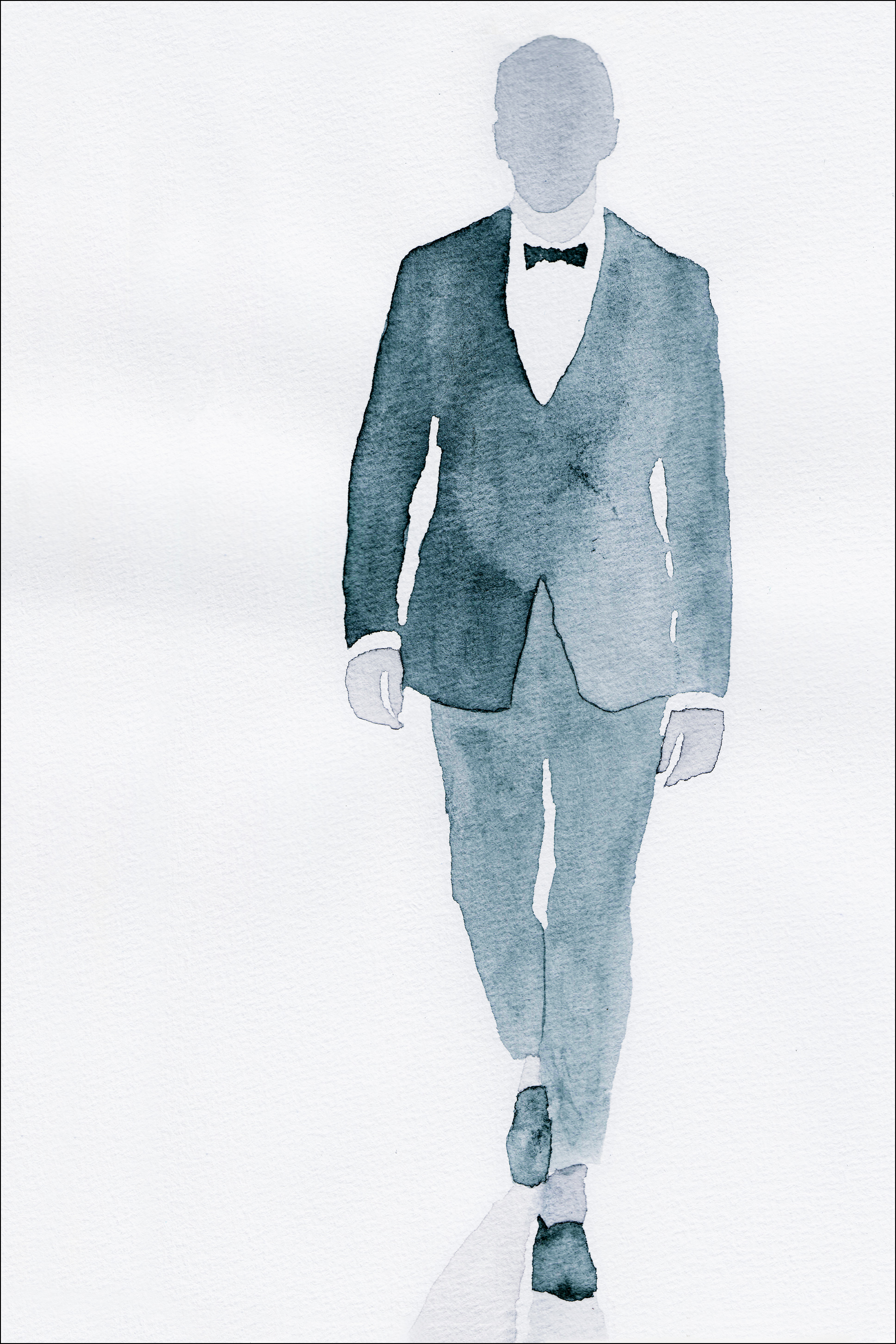 Portrétní plakát s mužem ve smokingu, který jde. Jednoduchý, ale přesto efektní, tento modrý obraz ukazuje postavu, ale bez zobrazení detailů. Kdo je ten tajemný muž? To je na vás, abyste rozhodli, když pověsíte obrázek doma.