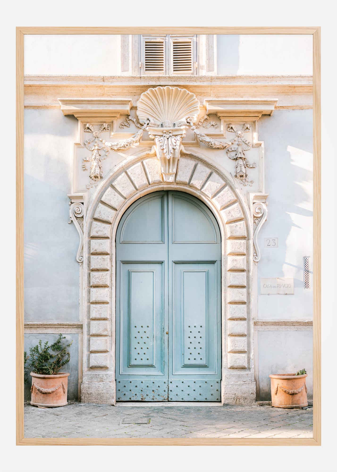 Tento plakát zachycuje krásu a kouzlo klasické evropské architektury. Světle modré dvoukřídlé dveře jsou obklopeny elegantním kamenným portálem s jemně vyřezávanými detaily a ozdobami, které vytvářejí pocit historického bohatství a kulturního dědictví. Nad dveřmi se nachází impozantní mušlový oblouk, který dokončuje tento majestátní vstup. Na každé straně dveří jsou umístěny květináče se zelenými rostlinami, které dodávají přirozený a živý kontrast k kamenné fasádě. Tento obraz vyzařuje klidnou a vznešenou atmosféru, ideální pro dodání nádechu klasické krásy do každého domova.