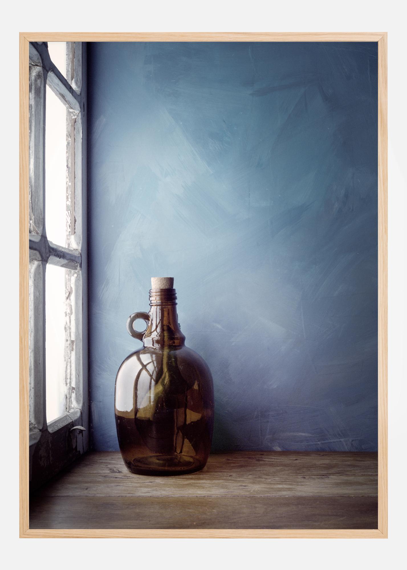 Plakát zátiší s hnědou lahví proti modré stěně. Světlo z okna svítí zleva a osvětluje láhev, která vytváří odrazy. Přidejte vašemu domovu rustikální atmosféru s jemnou modrou zdí a starým dřevěným stolem, na kterém láhev stojí.