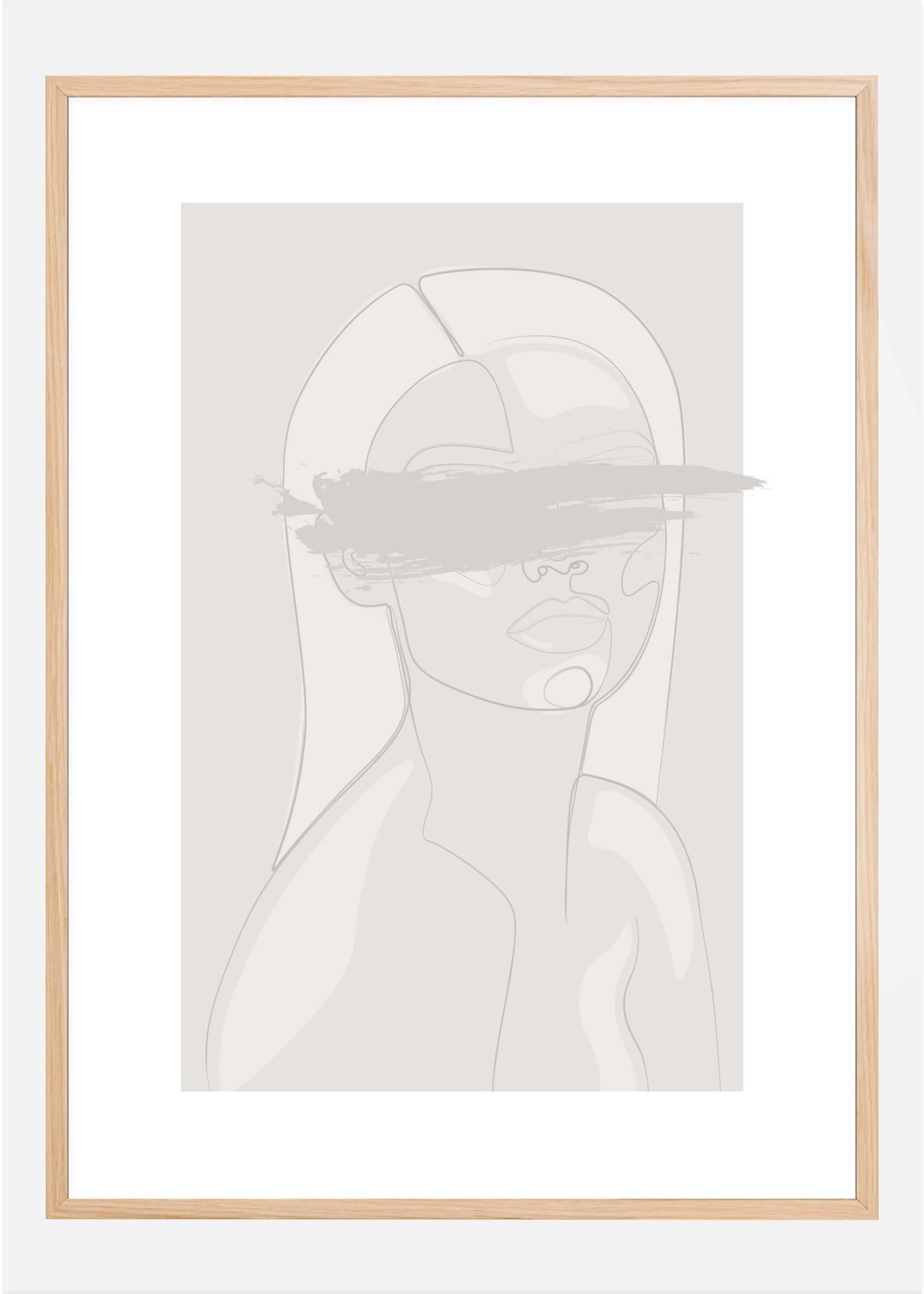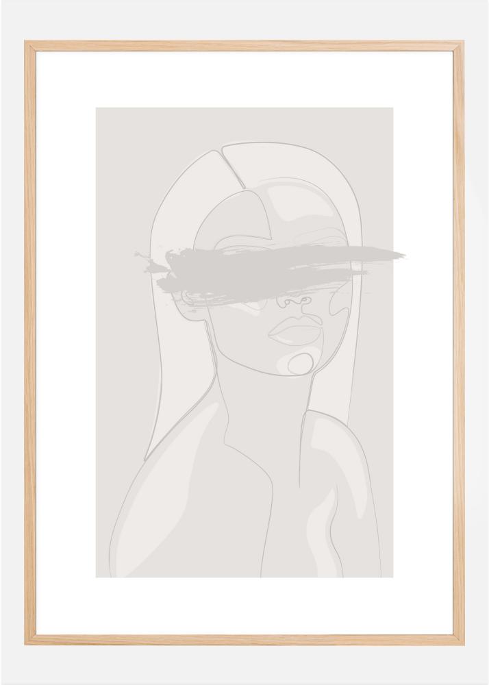 Abstraktní plakát se ženou se zakrytýma očima. Tento světlý bílý a šedý obrázek ukazuje hlavu a ramena ženy ve formách bloků a linií. Stříkanec barvy zakrývá oči, čímž vytváří tajemství kolem ženy. Silný bílý rámeček ji orámuje, ideální pro zavěšení na odvážně zbarvenou stěnu v domě.