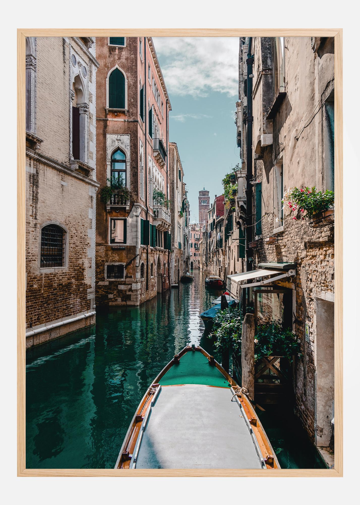 Tento poutavý plakát zachycuje podstatu malebného kanálu v Benátkách, s tradiční gondolou v popředí. Světlo krásně dopadá na barevné fasády okolních budov a odrazy na klidné vodě vytvářejí zrcadlení, které je jak jasné, tak okouzlující. Odstíny zemité červené a oranžové v zdivu budov kontrastují s klidnou akvatickou modrozelenou barvou kanálu.