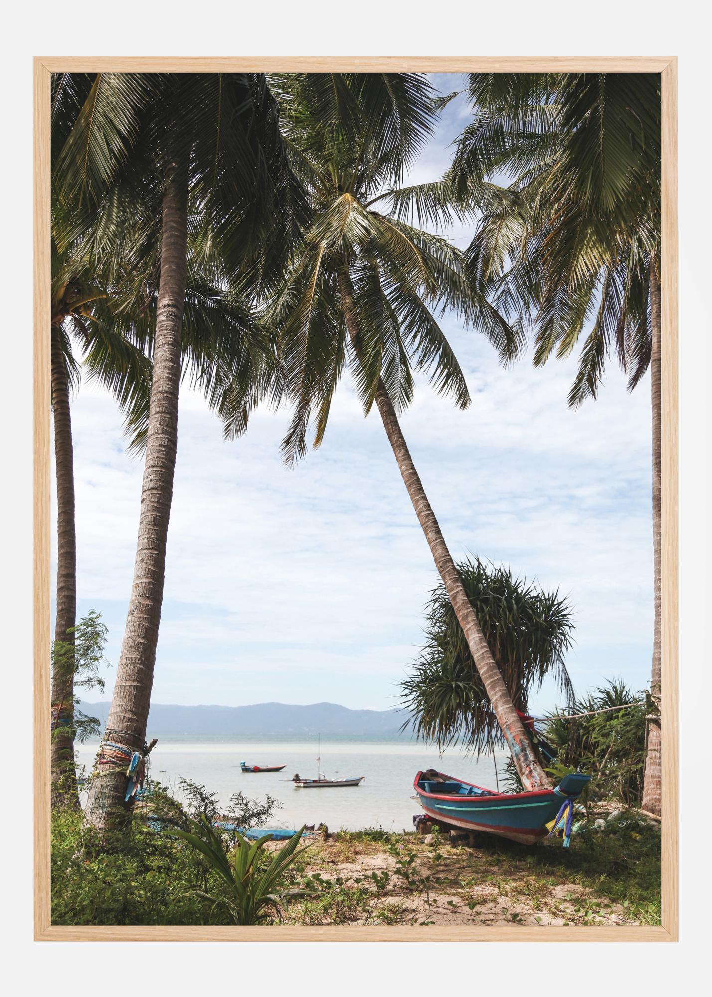 Plakát z dovolené s palmami a loděmi v Thajsku. Dva palmy se naklánějí k sobě, což rámuje moře za nimi, kde se nacházejí dvě lodě. Třetí červená a modrá loď leží na zemi a přitahuje pozornost. Představte si, že stojíte na pláži a díváte se na tento klidný obrázek.
