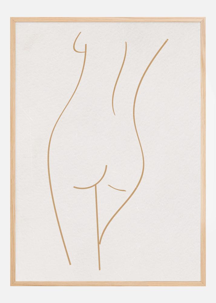 Jednoduchý kreslený plakát se ženou se zády k tobě. Tenoučké hnědé linie jsou vše, co je potřeba k vytvoření tvaru této ženy, která stojí zády. Linie vedou pohled vzhůru podél zad v tomto jednoduchém, ale elegantním kreslení na bílém pozadí.