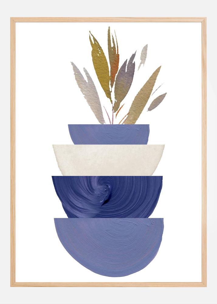 Uprostřed horní mísy se zvedají abstraktní tvary připomínající listoví nebo peří, malované v přírodních barvách jako je olivově zelená, rezavě hnědá, šedá a béžová. Organické tvary spolu s geometrickými mísami vytvářejí jedinečný kontrast, který je zároveň uspokojivý pro oči a nutí k zamyšlení. Tento tisk kombinuje prvky přírody a designu způsobem, který zachycuje podstatu moderního bohémského stylu, s paletou barev obsahující jak zemité tóny, tak chladné modré odstíny. Plakát nabízí elegantní a stylový prvek do každé místnosti, ať už je to obývací pokoj, ložnice nebo kancelář.