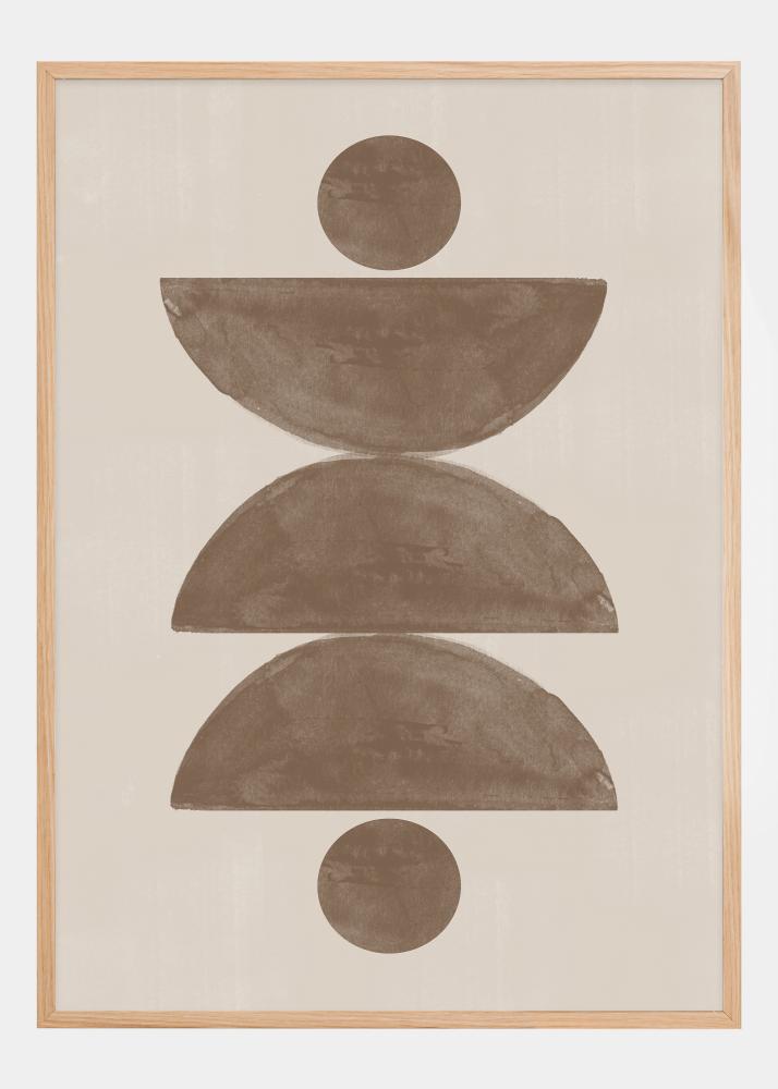 Tento uklidňující a esteticky uspokojivý plakát představuje harmonické skládání měkkých geometrických tvarů. Dva půlměsíce v zemitě hnědém tónu jsou vyváženy dvěma plnými kruhy, symetricky umístěnými nad a pod nimi. Tato minimalistická kompozice nabízí pocit klidu a je dokonalou reprezentací bohémského stylu s jemným a moderním nádechem.