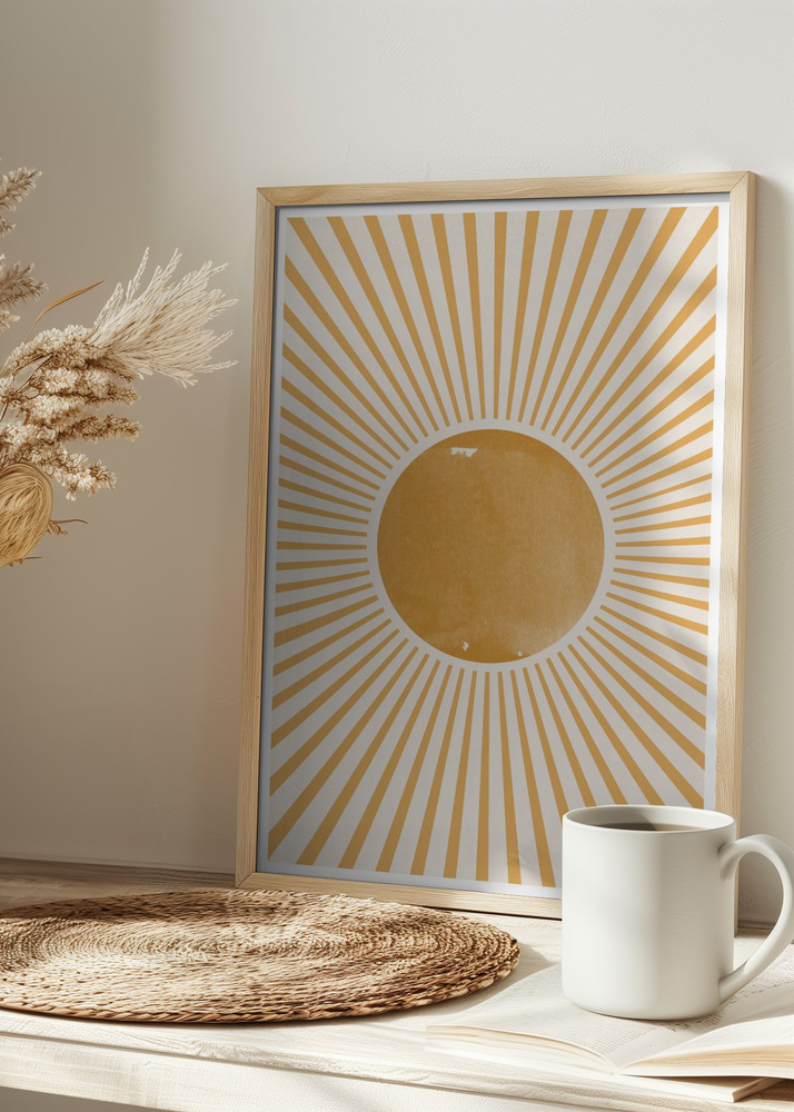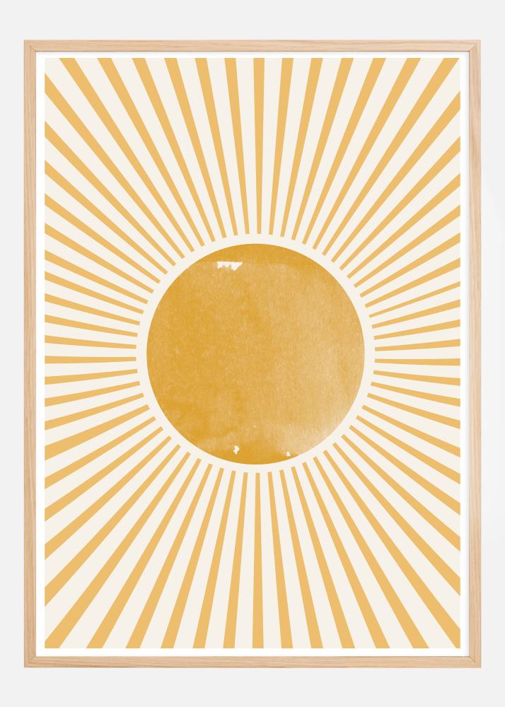 Tento živý plakát vyvolává pocit zářivého slunce se svými vyzařujícími liniemi ve zlatých tónech, které obklopují centrální žlutý kruh na jemném bílém pozadí. Design je inspirovaný bohémskými a geometrickými vzory, které společně vytvářejí obraz slunečního tepla a energie. Teplé barvy a zářivý vzor jsou navrženy tak, aby vyvolávaly pocit radosti a pozitivity.