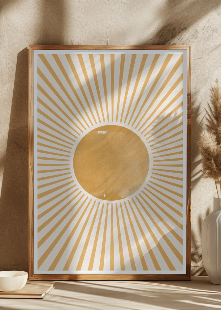 Tento živý plakát vyvolává pocit zářivého slunce se svými vyzařujícími liniemi ve zlatých tónech, které obklopují centrální žlutý kruh na jemném bílém pozadí. Design je inspirován bohémskými a geometrickými vzory, které společně vytvářejí obraz slunečního tepla a energie. Teplé barvy a zářivý vzor jsou navrženy tak, aby vyvolávaly pocit radosti a pozitivity.
