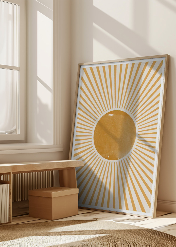 Tento živý plakát vyvolává pocit zářivého slunce se svými vyzařujícími zlatými liniemi, které obklopují centrální žlutý kruh na měkkém bílém pozadí. Design je inspirován bohémskými a geometrickými vzory, které společně vytvářejí obraz slunečního tepla a energie. Teplé barvy a zářivý vzor jsou navrženy tak, aby vyvolaly pocit radosti a pozitivitu.