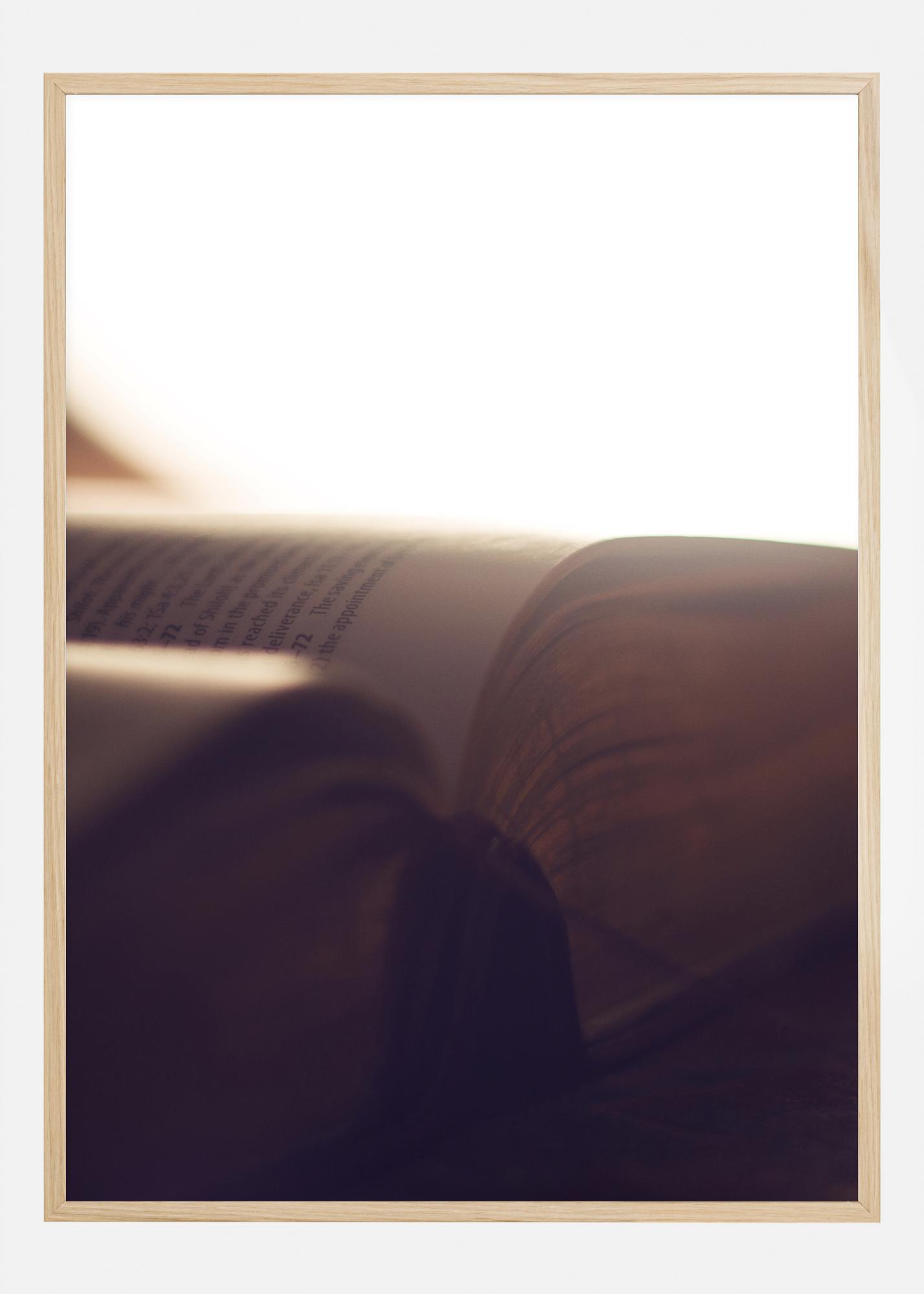 Blízký pohled na plakát s otevřenou knihou. Bílé světlo zaplňuje většinu tohoto obrázku, protože osvětluje knihu s pozlacenými okraji stránek. Slova jsou sotva viditelná, což činí tento tisk perfektním pro studovnu.