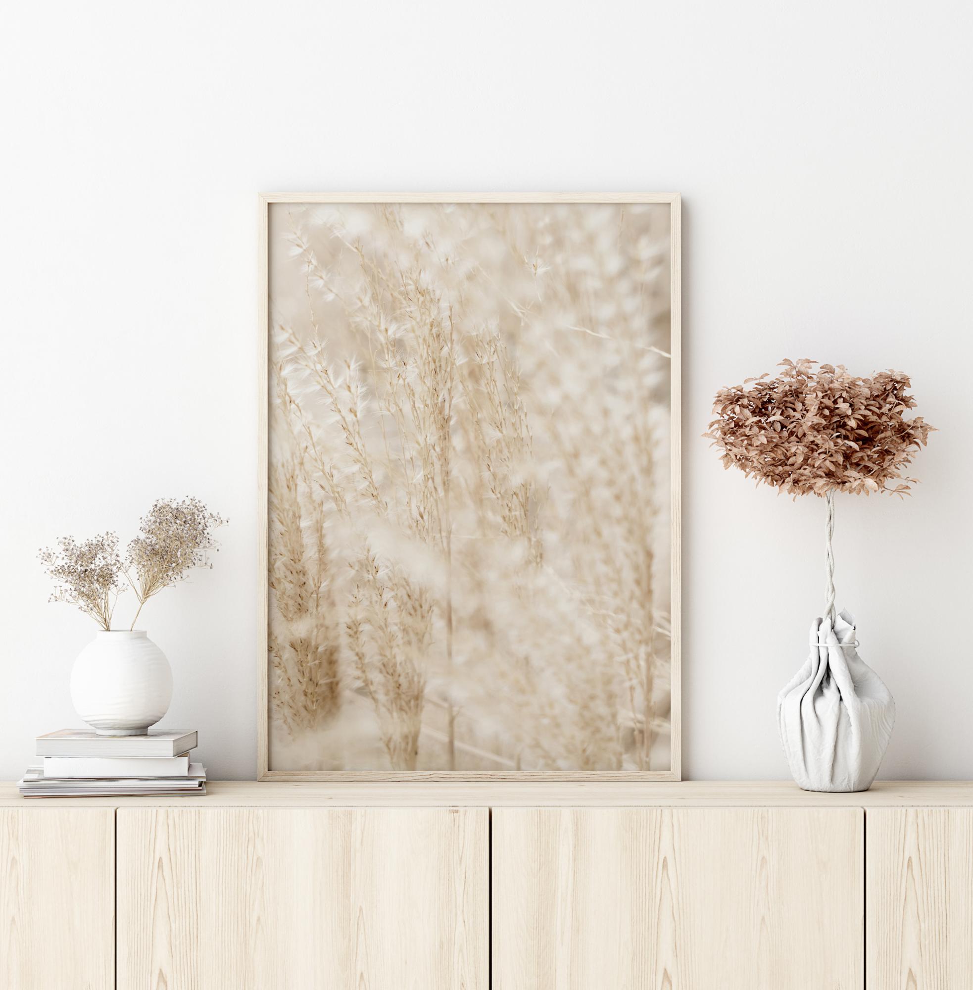 Měkce zlatý plakát s polem. Obrázek je uvolňující, s pšeničnými klasy jemně zaostřenými, jejich měkké konce jsou osvíceny téměř andělským bílým světlem. Pro poněkud uklidňující éterický pohled je toto ideální dílo k zavěšení na jednu z kontrastních stěn domova.
