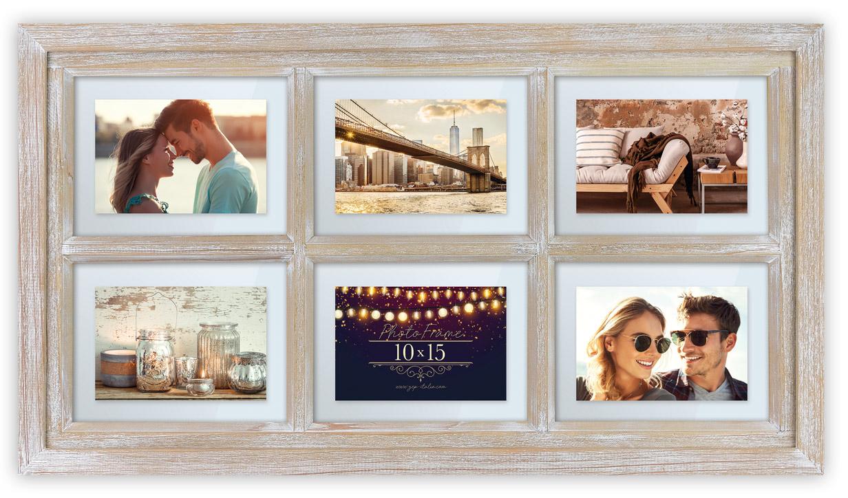 Ležící kolážový rám ve světle dřevěné barvě. Toto je rám, který pojme 6 fotografií o velikosti 10x15 cm a umožňuje snadno uspořádat skupinu obrázků dohromady krásným způsobem. Rám má mírné dřevěné detaily, které mu dodávají rustikální, ale zároveň venkovský charakter. Vnější rozměry rámu jsou 38,5x69,5 cm. Nástěnný držák je k dispozici.