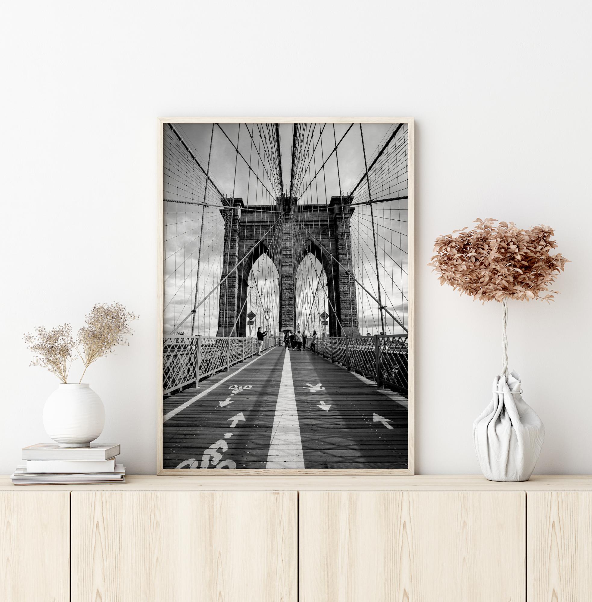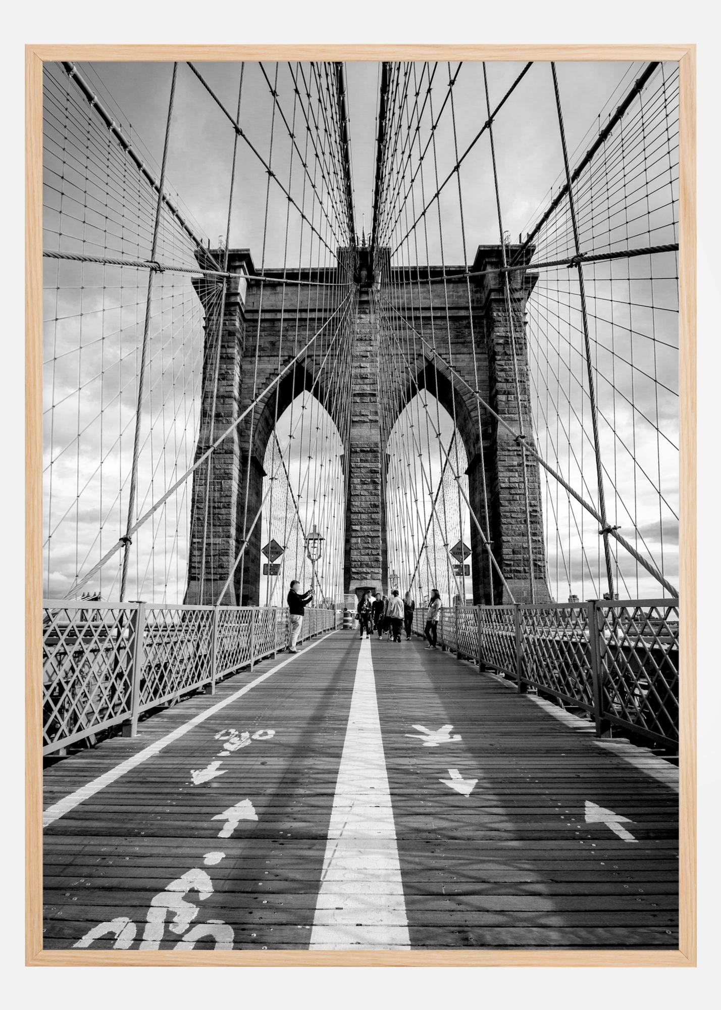 Černobílá fotografie pěší cesty Brooklynského mostu, mohutné věže a vzrušující zavěšovací zařízení ve formě ocelových drátů ve velkých mřížích. Plakát, který se skvěle kombinuje s dalšími oblíbenci ve větší koláži.
