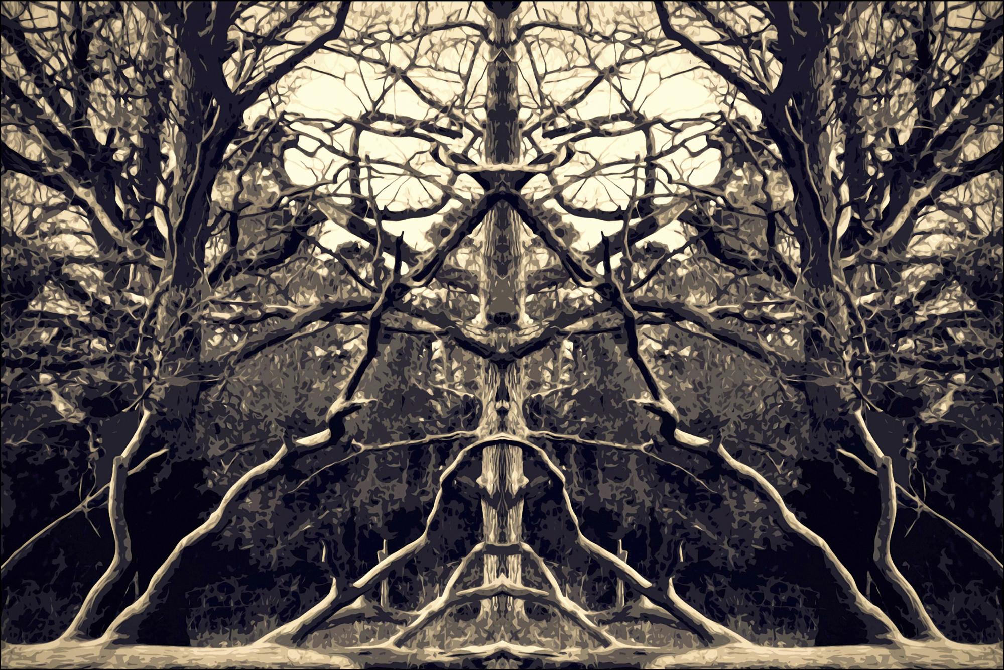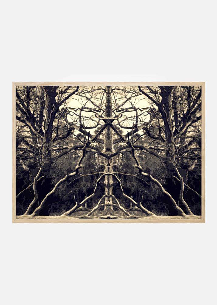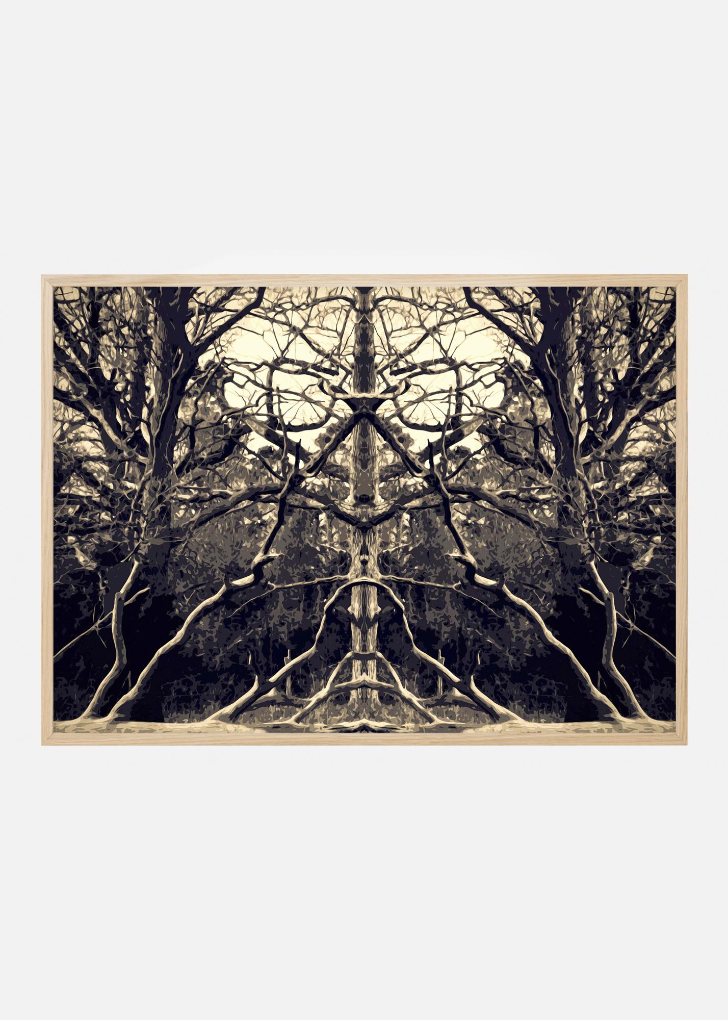 Úžasný kaleidoskopický plakát se stromy a větvemi. Zrcadlený obraz přírody poskytuje fascinující plakát, kde můžete vidět všemožné obličeje a tvary. Světlé sépiové tóny na tomto obrázku ladí s pastelovými barvami pro jemnější pocit v kontrastu ke složitosti obrázku.