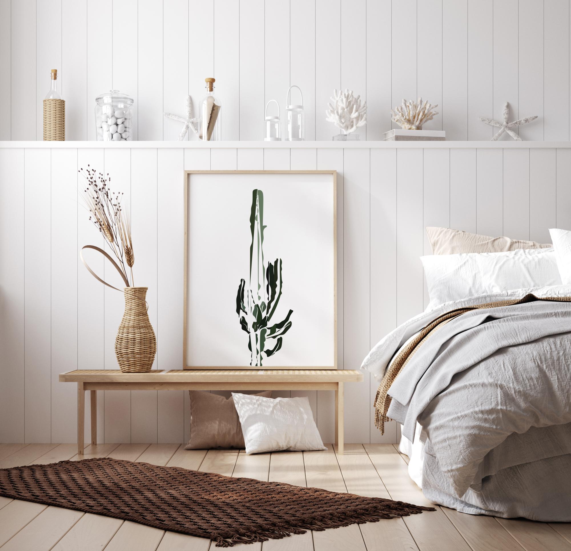 Grafický umělecký plakát kaktusu v různých odstínech zelené, vytvořený umělkyní Linn Westanbäck. Nádherně minimalistický a ideální k kombinaci s dalšími díly Linn!