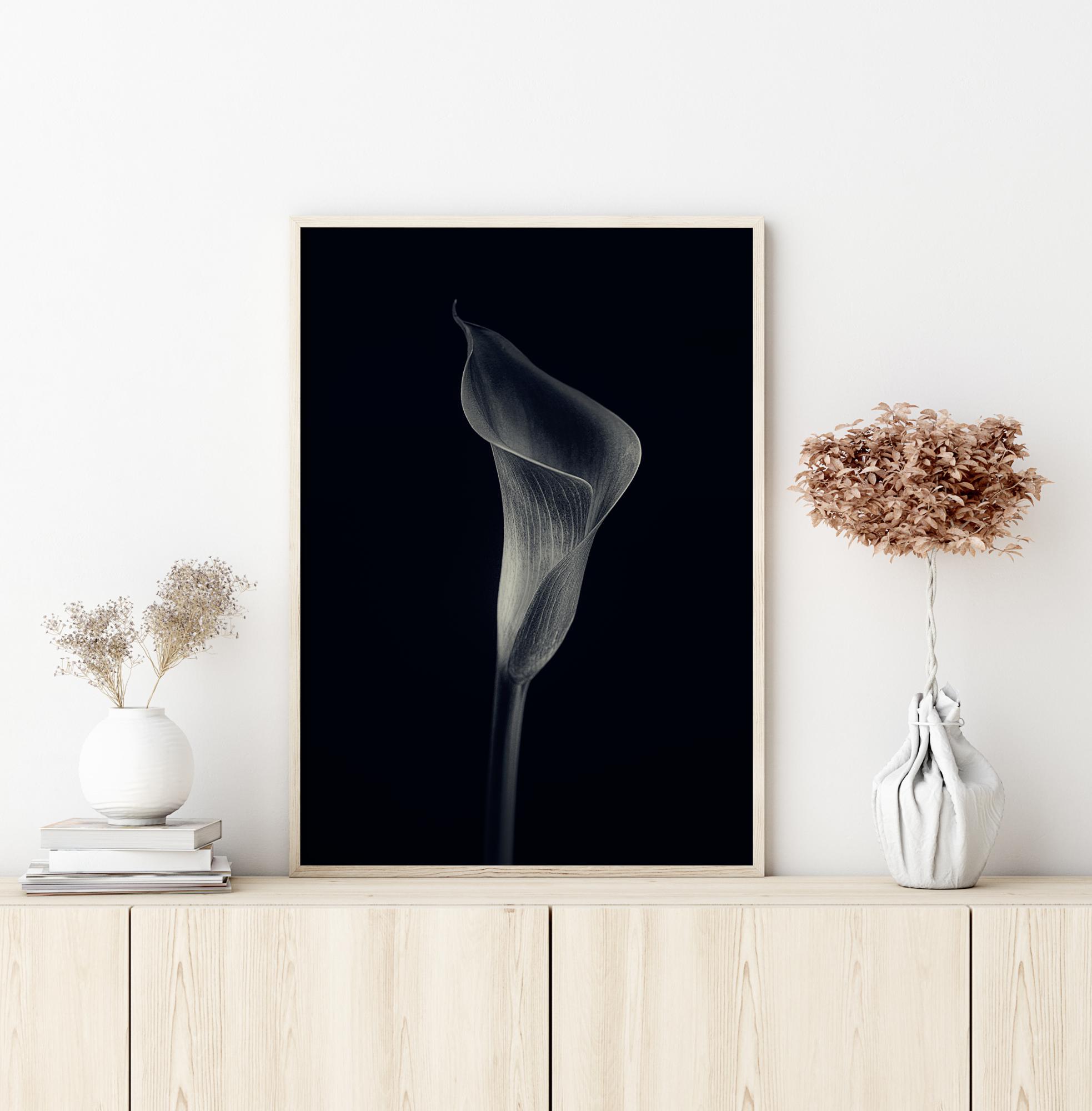 Plakát s osamělou lilií, která vytváří éterickou záři. Obrácený negativ této lilie dodává květině mystiku proti černému pozadí. Tato neobvyklá fotografie se stává samozřejmým tématem rozhovoru, když visí na bílé stěně pro zvýšení dramatického efektu.