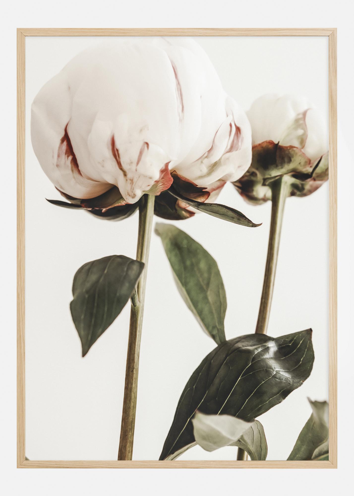 Tento plakát zachycuje výjimečnou krásu pivoněk v plném rozkvětu. Velké, nadýchané květy, s jemně složenými okvětními lístky v odstínech bílé a rezavě červené, stojí hrdě na svých silných stoncích. Tmavě zelené listy tvoří silný podklad, který zvýrazňuje jemnou strukturu květů a bohaté barevné tóny.