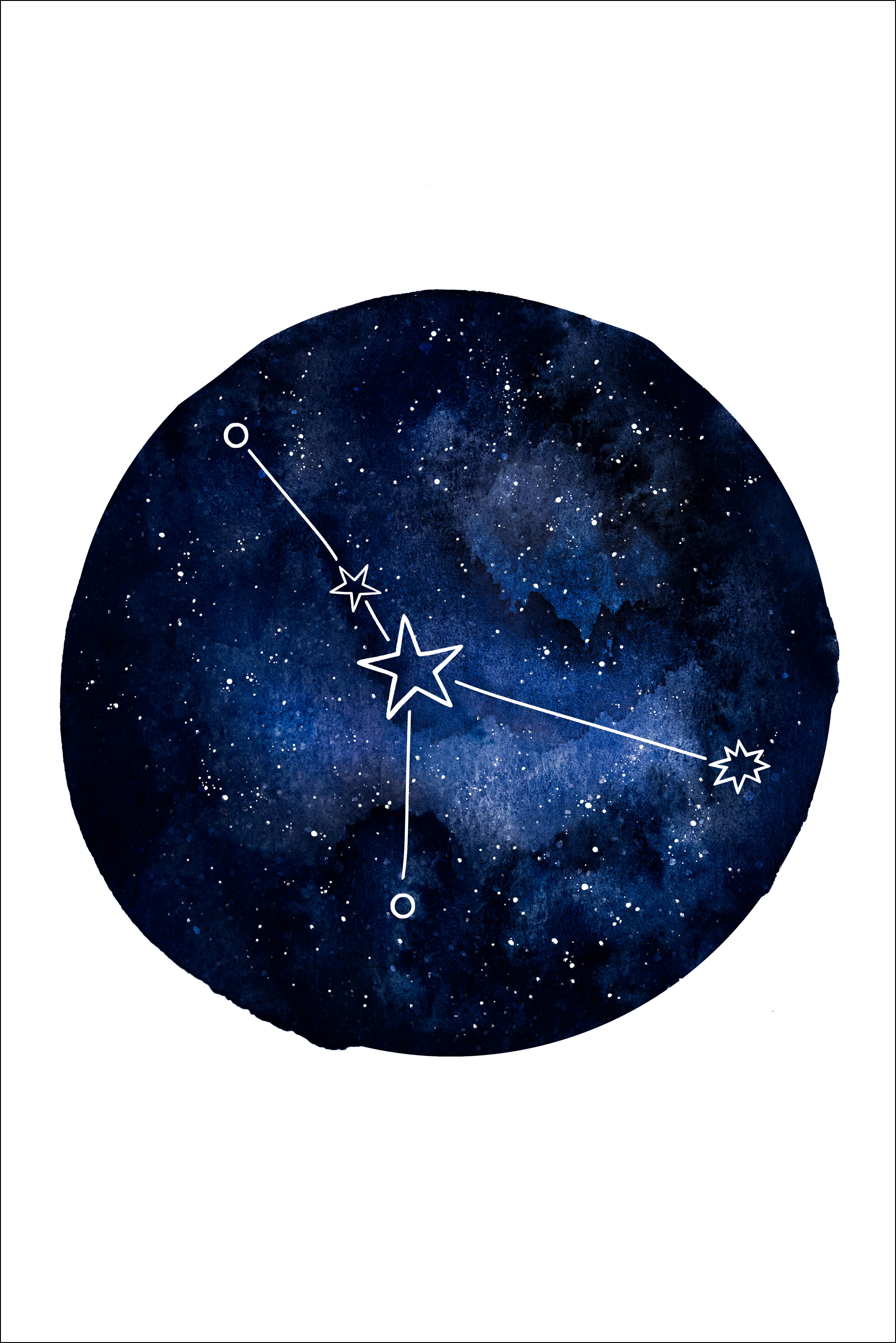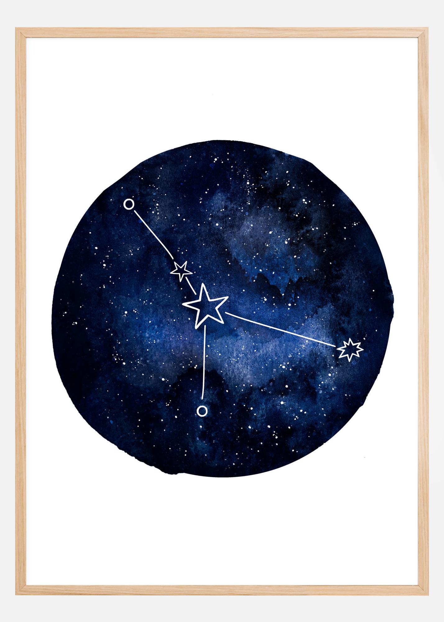Horoskopový plakát s Rakem. Tmavě modrý kruh vyplňuje střed tohoto bílého obrázku. V kruhu jsou různé odstíny modré, stejně jako různé hvězdy. Znamení zvěrokruhu Raka je výrazné ve středu. Pokud milujete svoje znamení zvěrokruhu, tento obrázek je nezbytností na vaší zdi.