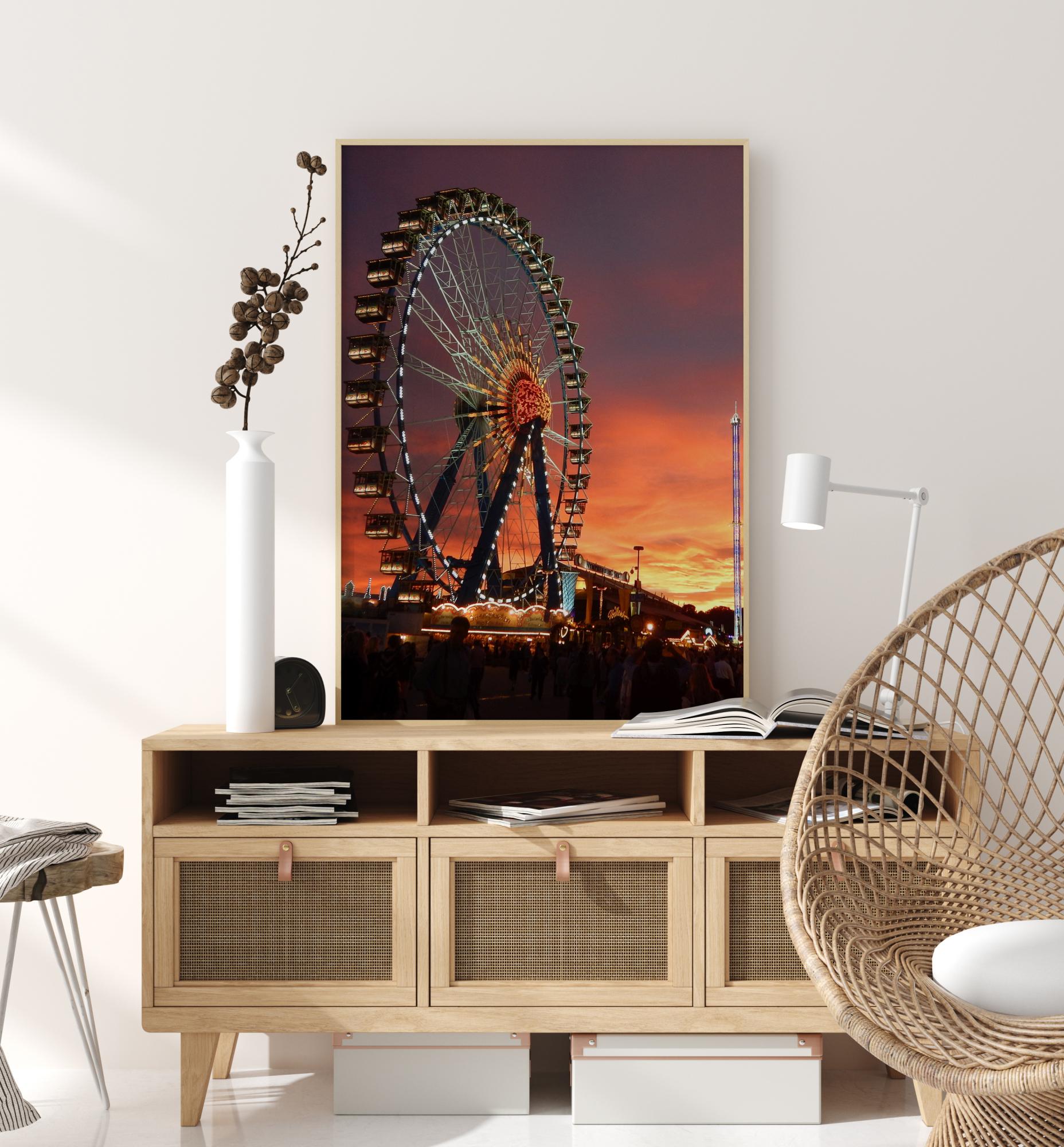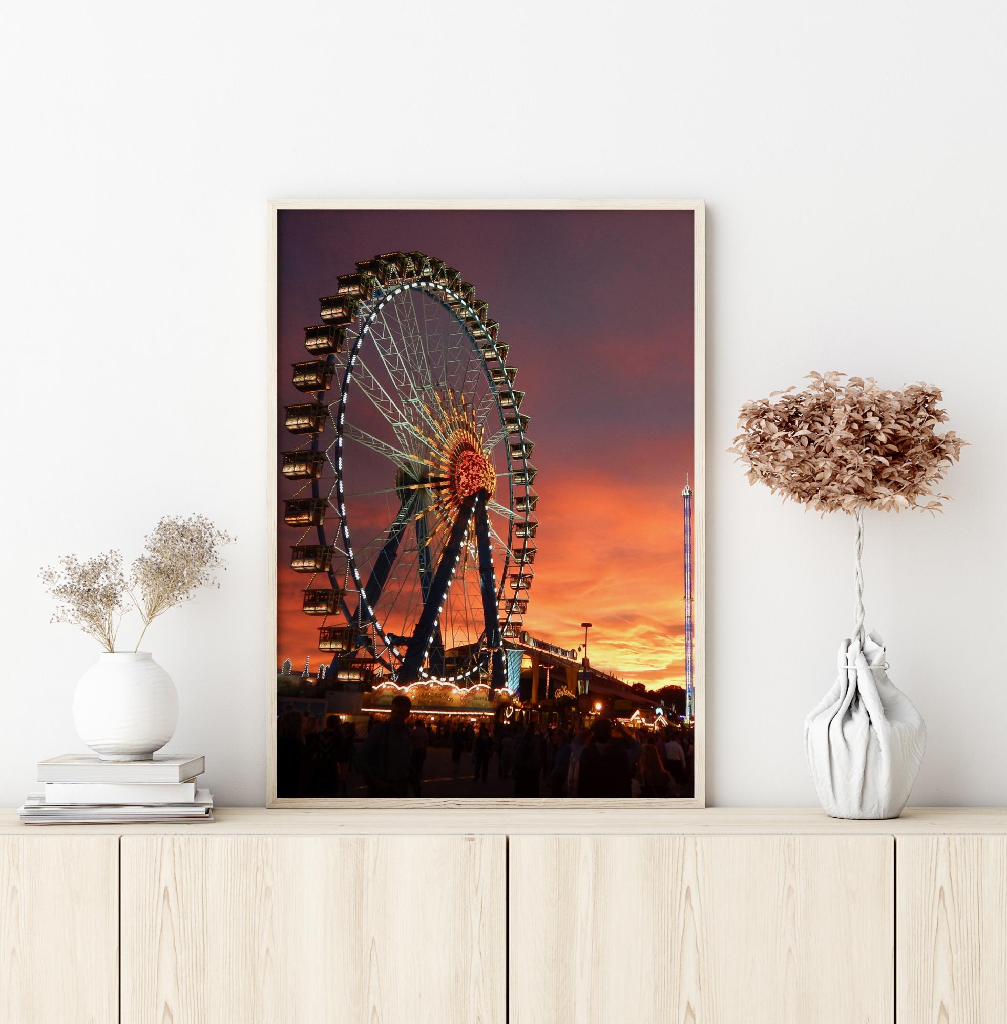 Úžasný plakát s ruským kolem v noci. Vlevo stojí kolo a září jasným světlem. Dole dav lidé pozoruje kolo, zatímco slunce zapadá do úžasné oranžové a fialové noční oblohy. Přidejte trochu nočního dramatu na své stěny pomocí tohoto plakátu.