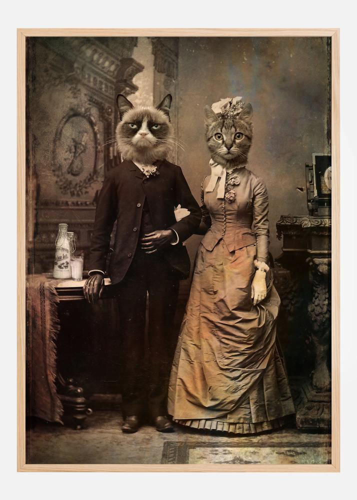 Komický plakát zobrazující kočičí pár oblečený ve viktoriánském oblečení. Nabručený kocour a jeho nevěsta stojí v plné viktoriánské módě, včetně obleku a korzetu, na tomto sépiovém tisku. Přineste trochu smíchu do svého domova s tímto obrazem na zdi obývacího pokoje.