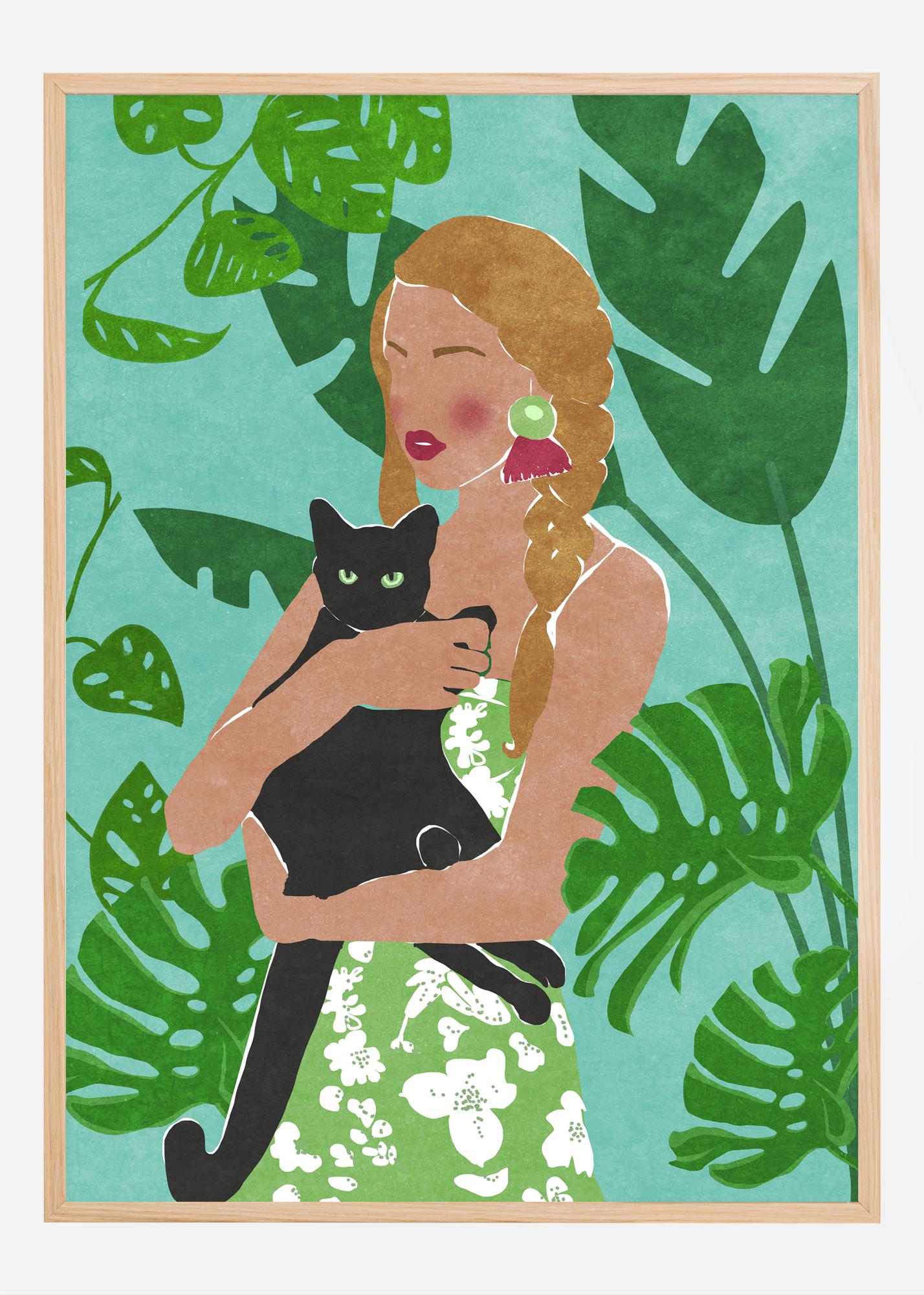 V plakátu dominují klidné a zemité tóny. Zelené odstíny rostlin a pozadí poskytují pokojný kontrast vůči béžovým a hnědým tónům ženy a hluboké černé barvě kočky. Detaily na bílých šatech s květinovým motivem dodávají kompozici lehkost. Plakát je obklopen dřevěným rámem (není zahrnut v motivu), který dále umocňuje přirozený pocit. Toto je tisk, který je nejen krásným interiérovým doplňkem, ale také vyjádřením přátelství ke zvířatům a oslavou jednoduchých radostí života.