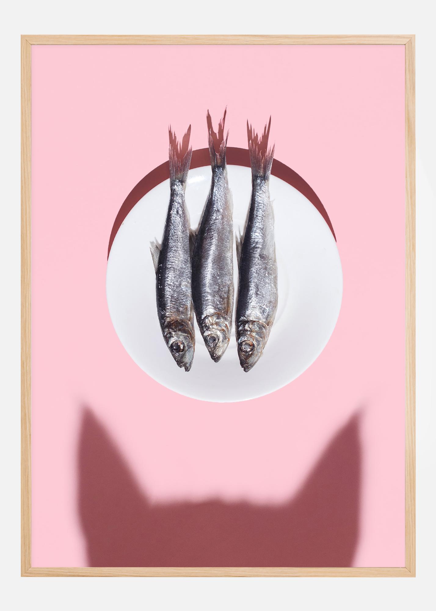 Tento umělecký plakát zobrazuje trio zářivých ryb spočívajících na čistě bílém talíři, který nabízí ostrý kontrast proti jemnému růžovému pozadí. Jeho minimalistická estetika z něj dělá poutavý doplněk do každého moderního domova. Hra mezi čistou bílou a uklidňující růžovou vytváří obraz, který je stejně tak tichým životem jako sofistikovanou designovou ozdobou. Nezaměnitelná silueta kočky, vytvořená světlem a stínem, přidává motivu hravou a kreativní stránku, což zaručuje, že tento plakát bude podnětem k rozhovorům.