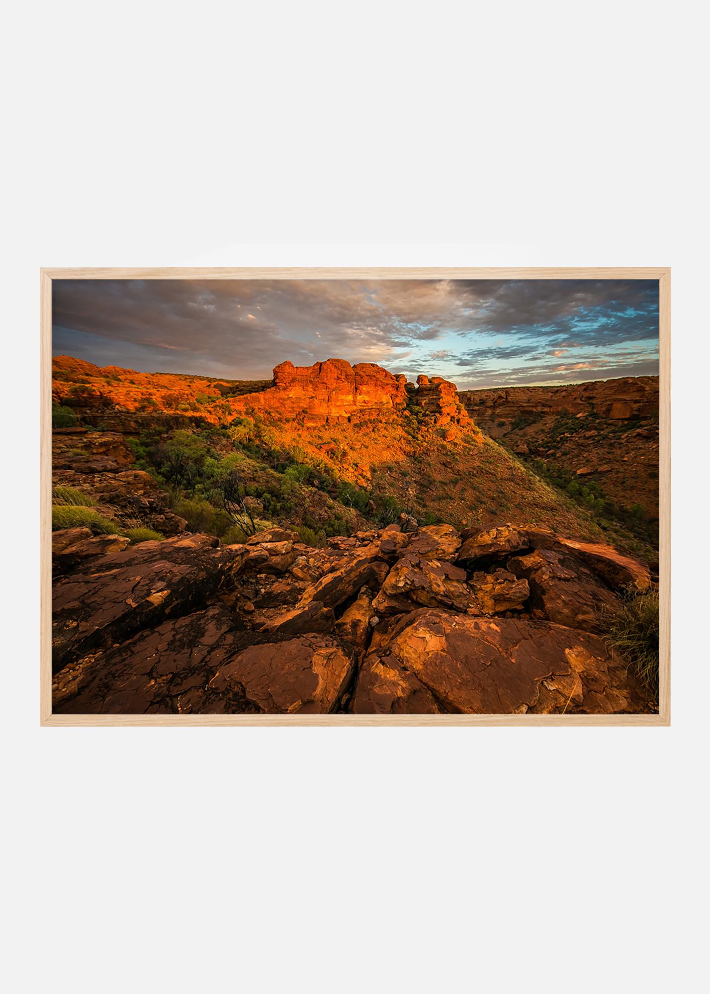Plakát s fotografií neúrodných červených hor při západu slunce, něco pro ty, kteří mají rádi pouště a skalní útvary na zeď. Teplé červené tóny proti ledově modré obloze a hloubka obrázku vytvářejí zajímavý motiv. Oblečte plakát do pěkného fotorámu a umístěte na stěnu spolu s dalšími motivy z pouště.