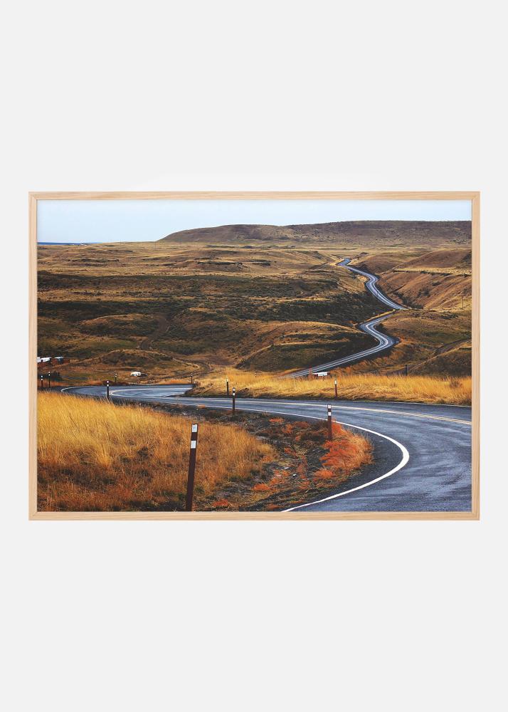 Plakát s asfaltovou cestou, která se vine sluncem vypálenou stepní krajinou. Žlutohnědé odstíny trávy proti chladnému povrchu asfaltu, který proráží otevřenou krajinou, přitahují pohled do obrazu a vedou podél cesty. Plakát se dobře hodí do minimalistického rámu, kde motiv vynikne a může být snadno kombinován s jinými obrazy na téma.