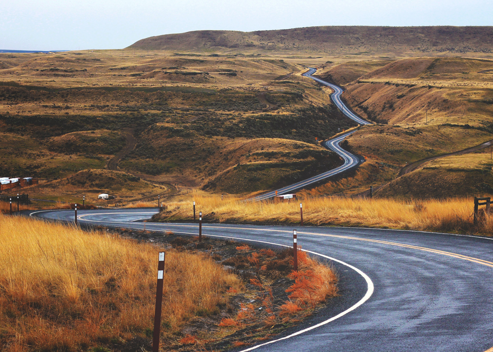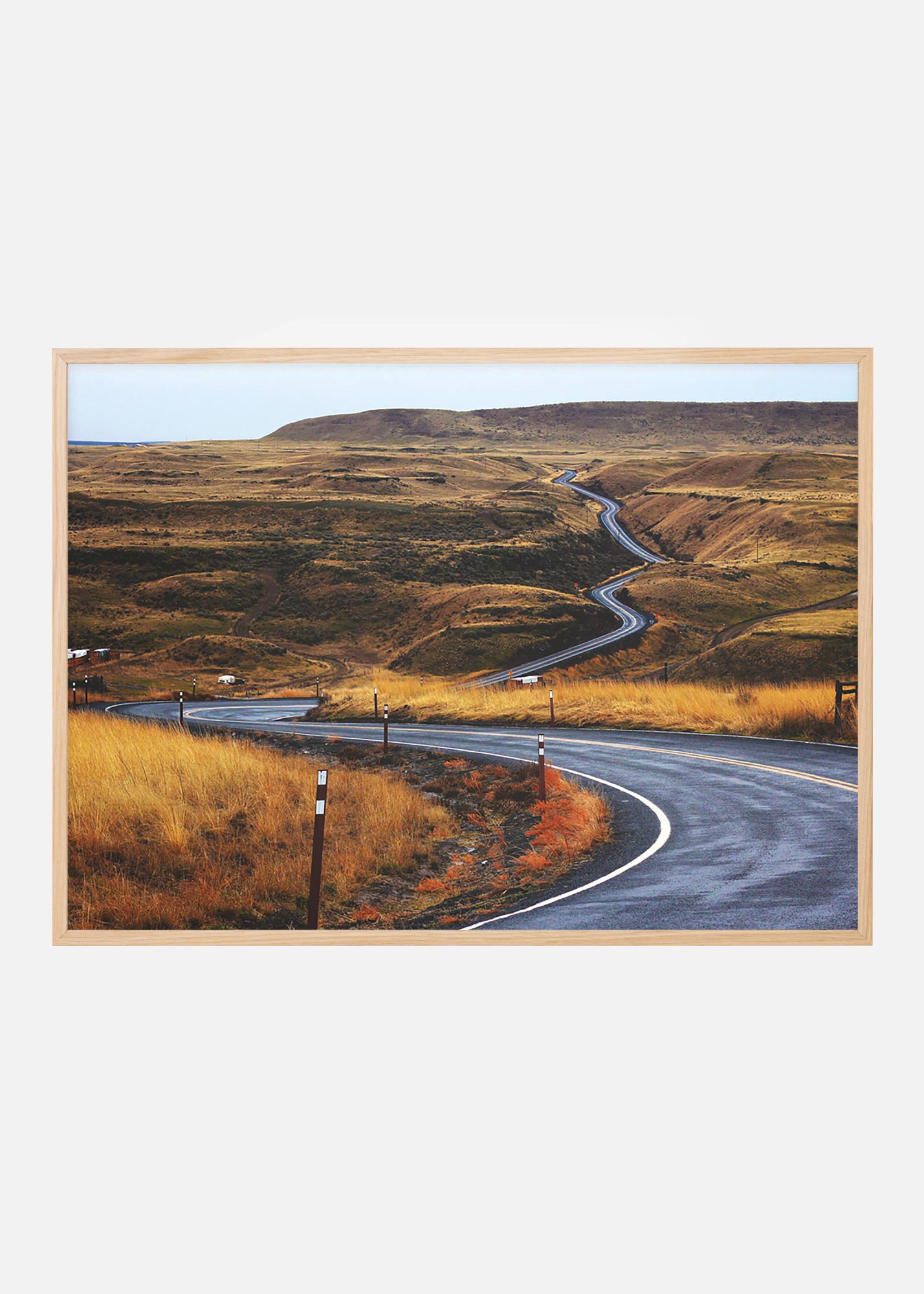 Plakát se silnicí z asfaltu, která se klikatí spálenou stepní krajinou. Žluto-hnědé odstíny trávy proti studenému povrchu asfaltu, který se prolomuje otevřenou krajinou, způsobují, že pohled je vtahován do obrazu a sleduje cestu. Plakát se hodí do minimalistického rámu, kde motiv vynikne, a může být rád kombinován s jinými obrazy k jednomu tématu.