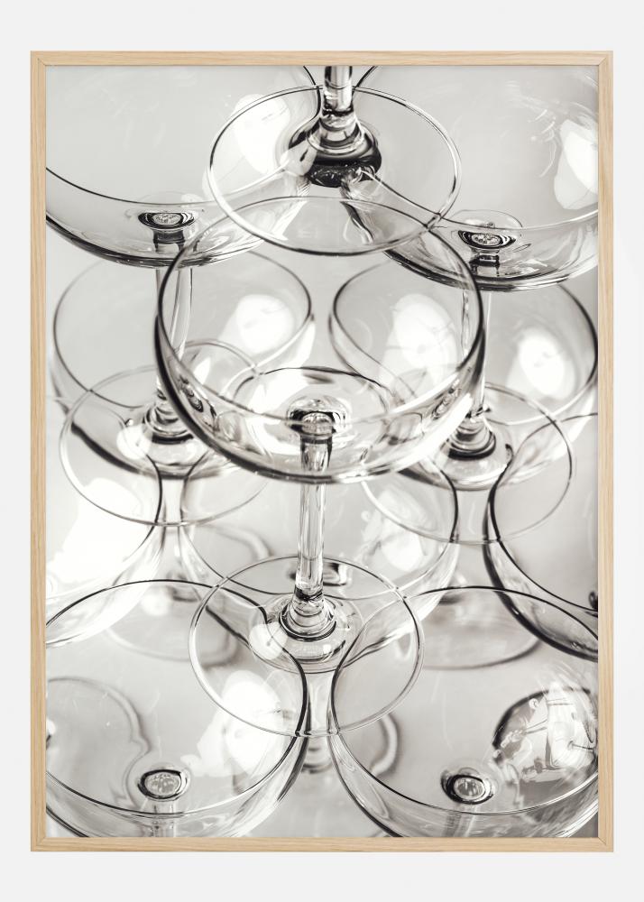 Tento elegantní a sofistikovaný plakát zachycuje krásu a jasnost kaskády šampaňských sklenic. Obraz zobrazuje detailní pohled na důmyslnou strukturu skla, kde se světlo odráží a láme průhledným materiálem, což vytváří tanec světla a stínů. Detailnost a jemná preciznost kompozice zvýrazňuje delikátní tvary sklenic a jemné odstíny skla.