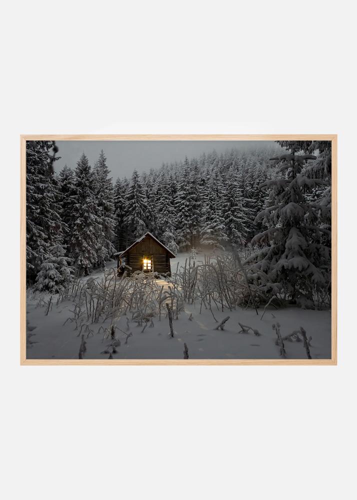 Plakát s roztomilou malou srubovou chatou v zimním šatu, hluboko v jehličnatém lese. Světlo z okna, které osvětluje mrazivou zimní noc, dodává fotografii hloubku a činí obraz zajímavým. Obrázek se hodí do všech interiérových stylů a prostředí. Bude stejně hezký v tenčím černém kovovém rámečku jako v robustnější variantě ze dřeva, nebo proč nevyzdvihnout světlo na obrázku v klasickém zlatém rámečku.