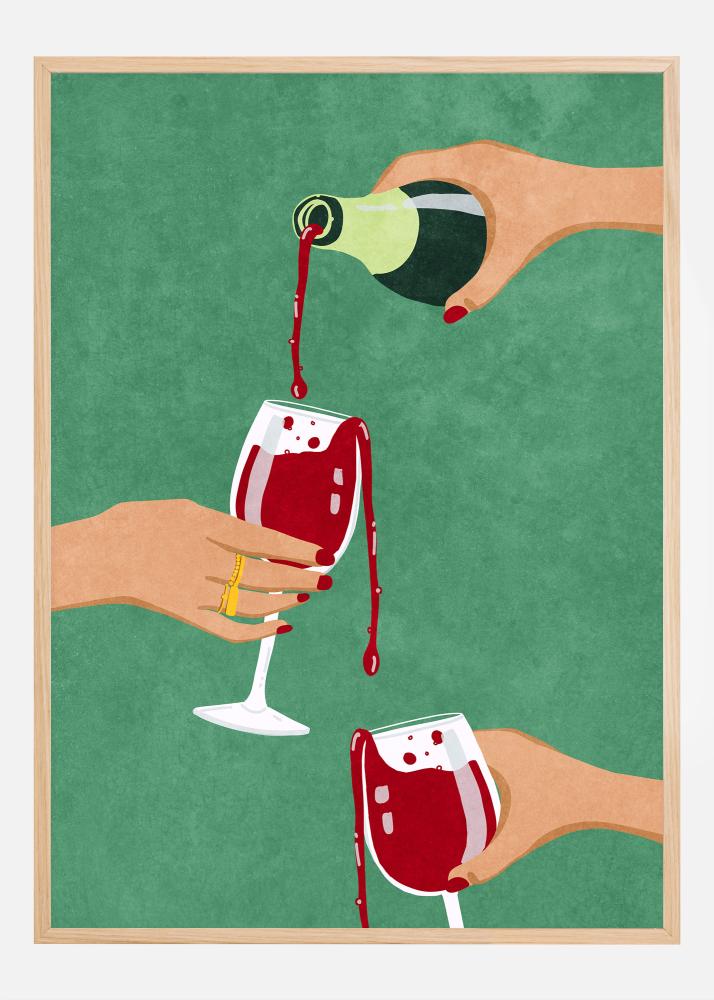 Tento hravý a sofistikovaný plakát zachycuje podstatu přátelství a oslavy. Ilustrace ukazuje tři ruce, které elegantně drží sklenice na víno a láhev, kde právě proud červeného vína nalévá do jedné ze sklenic. Tato scéna je poctou malým okamžikům, které činí život zvláštním, a je ideální volbou pro toho, kdo chce do svého domova přinést pocit sounáležitosti a slavnostnosti. Plakát je stejně tak začátek rozhovoru jako dekorativní prvek interiéru.