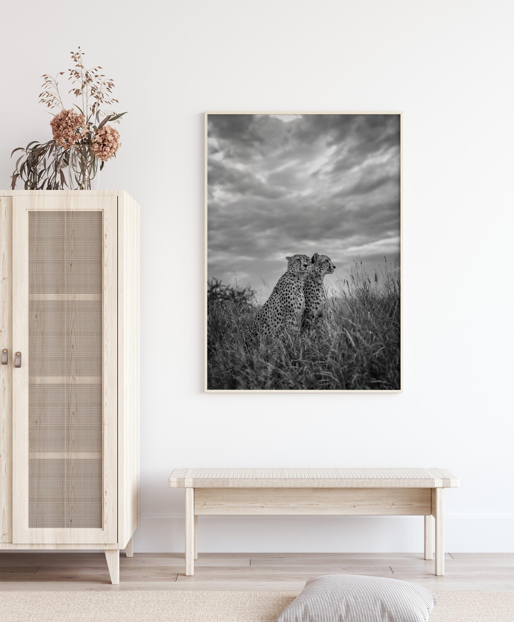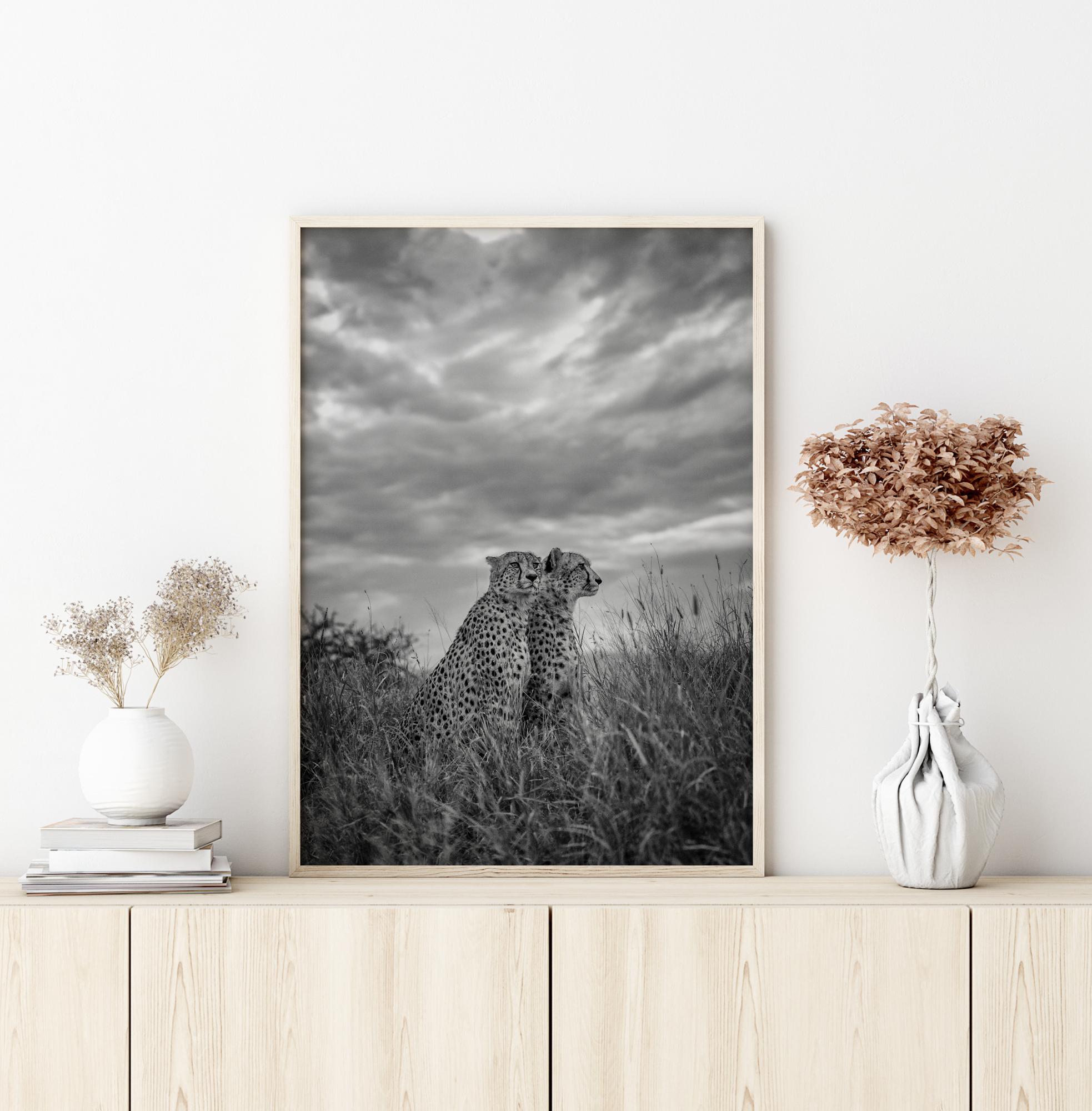 Přírodní plakát se dvěma gepardy, kteří hledí na africké pláně. Zamračená obloha kontrastuje s úžasnými skvrnami na těchto zvířatech. S tímto plakátem si můžete přinést domů velkolepost přírody.