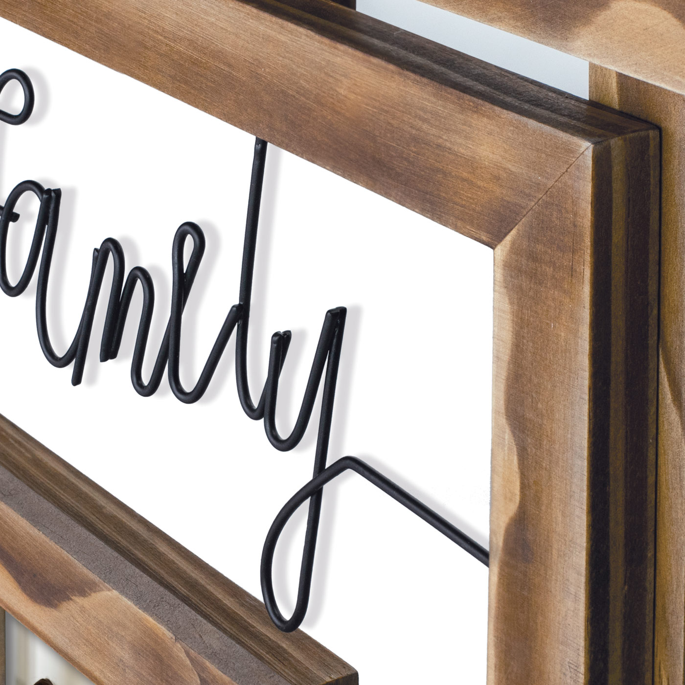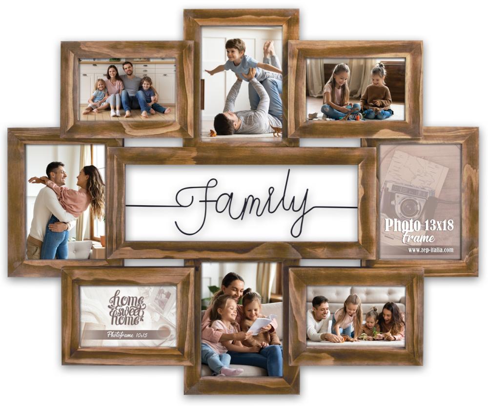 Tento krásný collage rám je ideální pro oživení vašich nejlepších vzpomínek s rodinou a zarámování! Collage rám je v teplém odstínu hnědého dřeva a uprostřed mezi rámy stojí slovo „rodina“ v černých písmenech. Rám pojme 8 obrázků ve velikosti 10x15 cm a 13x18 cm. Držák na zeď je součástí.