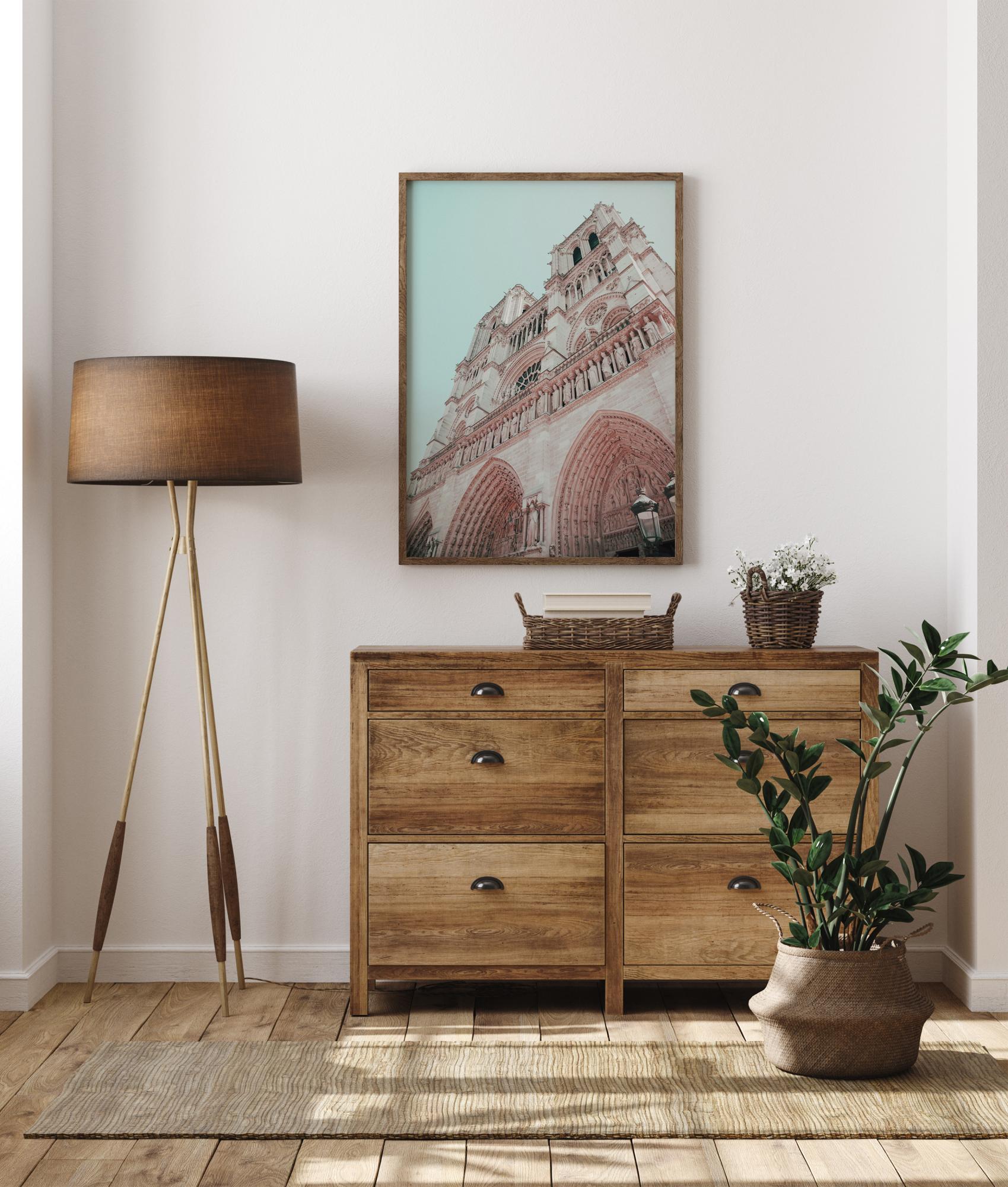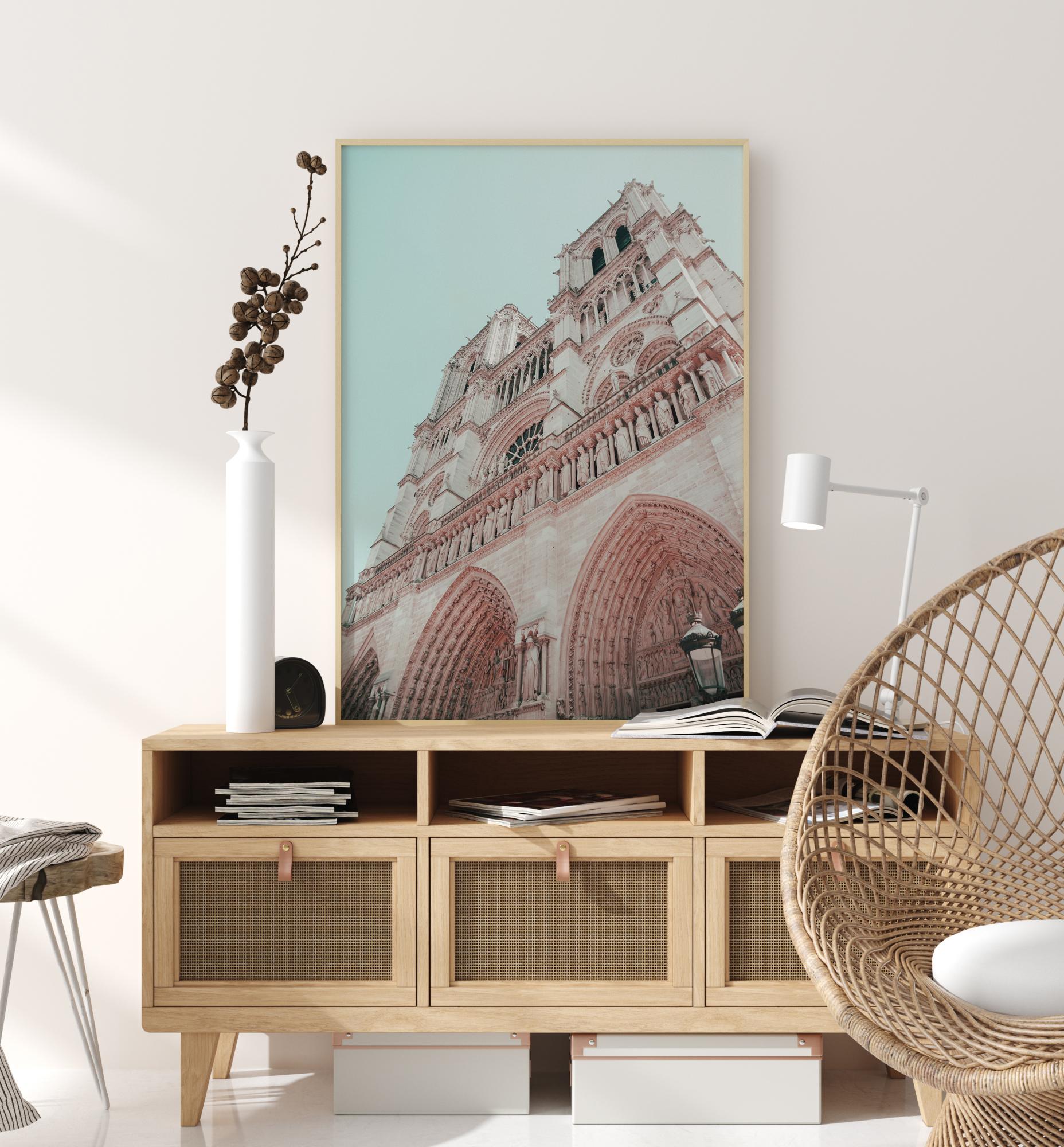 Dramatický plakát s fasádou kostela. Podívejte se vzhůru podél této bílé a růžové budovy s jejími gotickými oblouky, kamennými sochami a kulatými okny. Jemné pastelové barvy vytvářejí harmonický pocit, perfektní způsob, jak vytvořit uklidňující atmosféru doma.