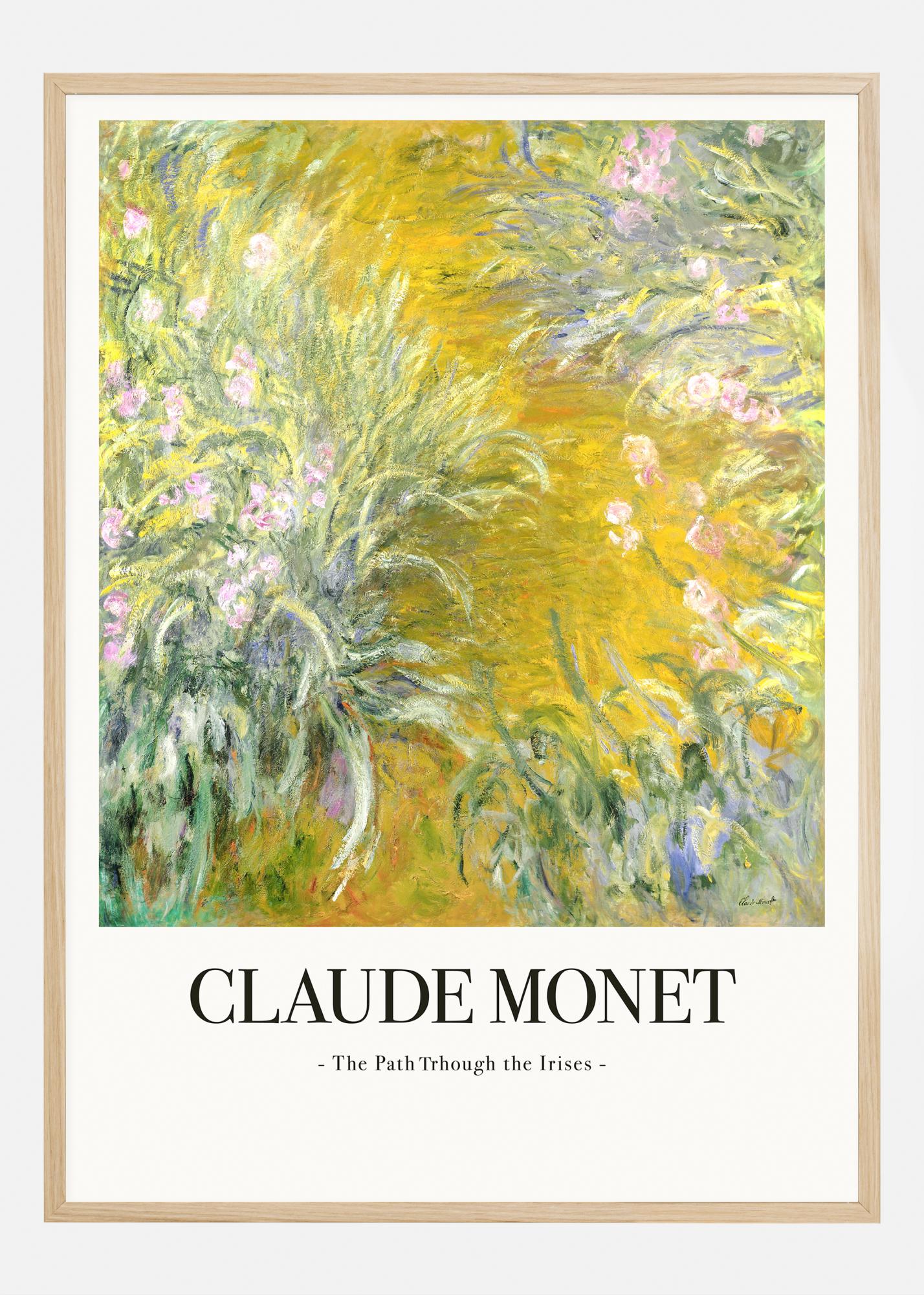 Titul plakátu, 'Cesta irisy', nás uvádí do vize Clauda Moneta o jeho zahradě, místě, které mu poskytlo nekonečnou inspiraci. Tato malba, která se přelévá živými žlutými a zelenými odstíny, doplněná charakteristickými fialovými a růžovými irisami, upoutává pozornost diváka a zve k procházce podél neviditelné cesty. Monetův podpis je diskrétně umístěn v rohu, což posiluje autenticitu uměleckého díla a jeho historický význam.