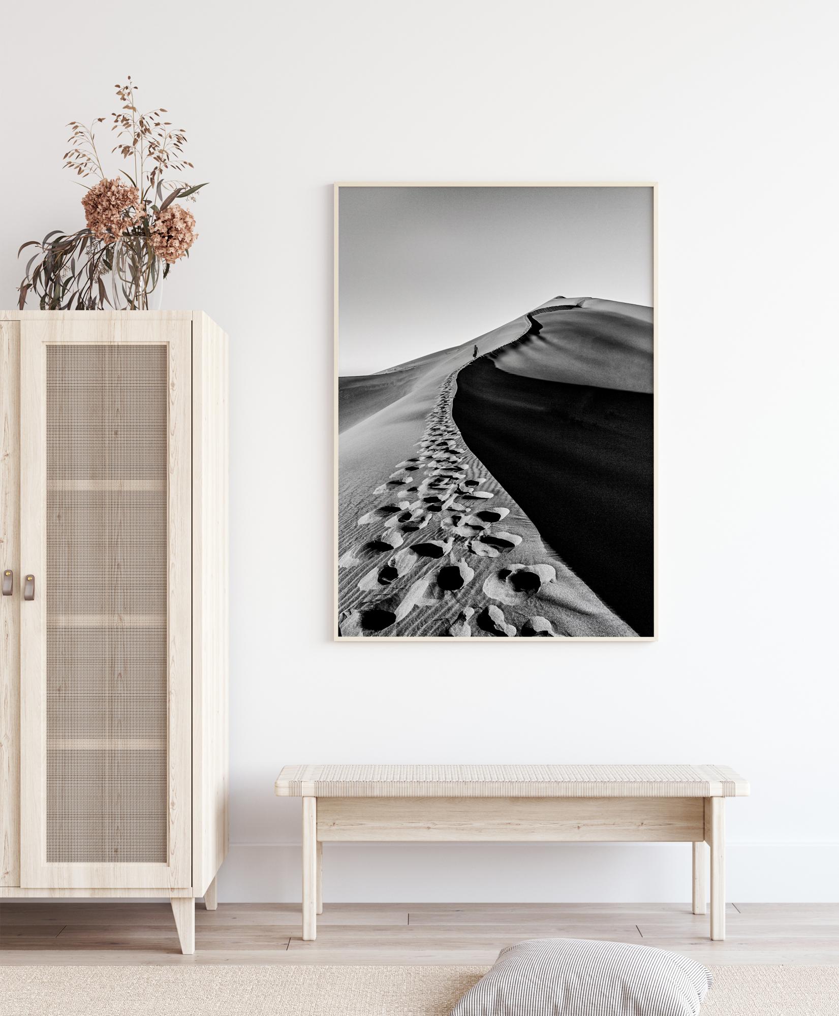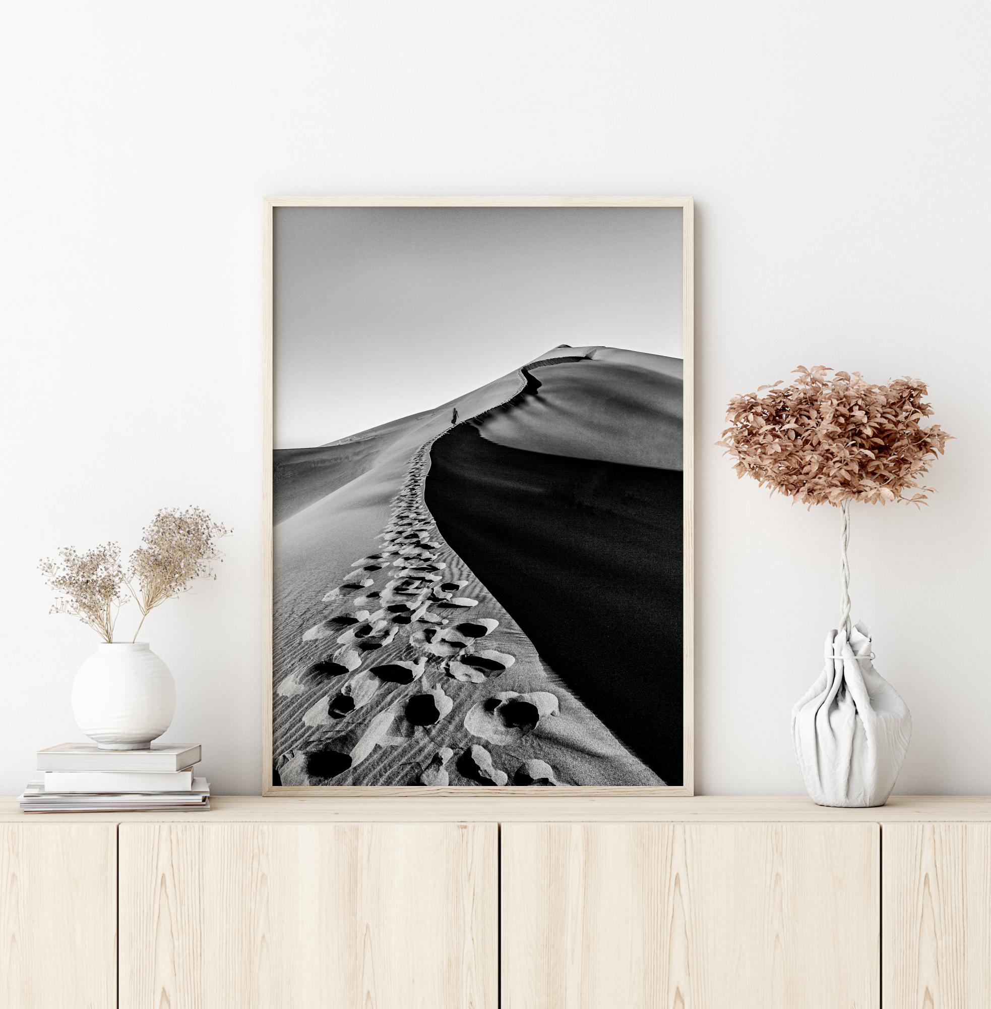 Úžasný plakát osoby, která šplhá po pískové duně. Fantastická černá stezka kontrastuje se stopami v písku, které směřují k vzdálené postavě. Tento obraz vytváří doma pocit dobrodružství.