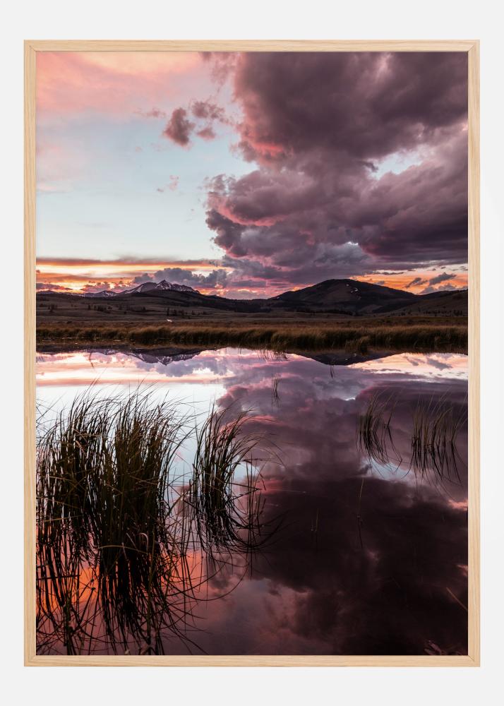 Krajinový plakát s jezerem, rákosím a úžasnými mraky nad horizontem. Rákosí stojí v jezeře a kymácí se ve větru, zatímco velké mraky se blíží nad ním a odrážejí se na vodní hladině. Dvě řady mraků vedou pohled k horizontu a načervenalému západu slunce. Užijte si drama v tomto silně pastelově zbarveném díle.