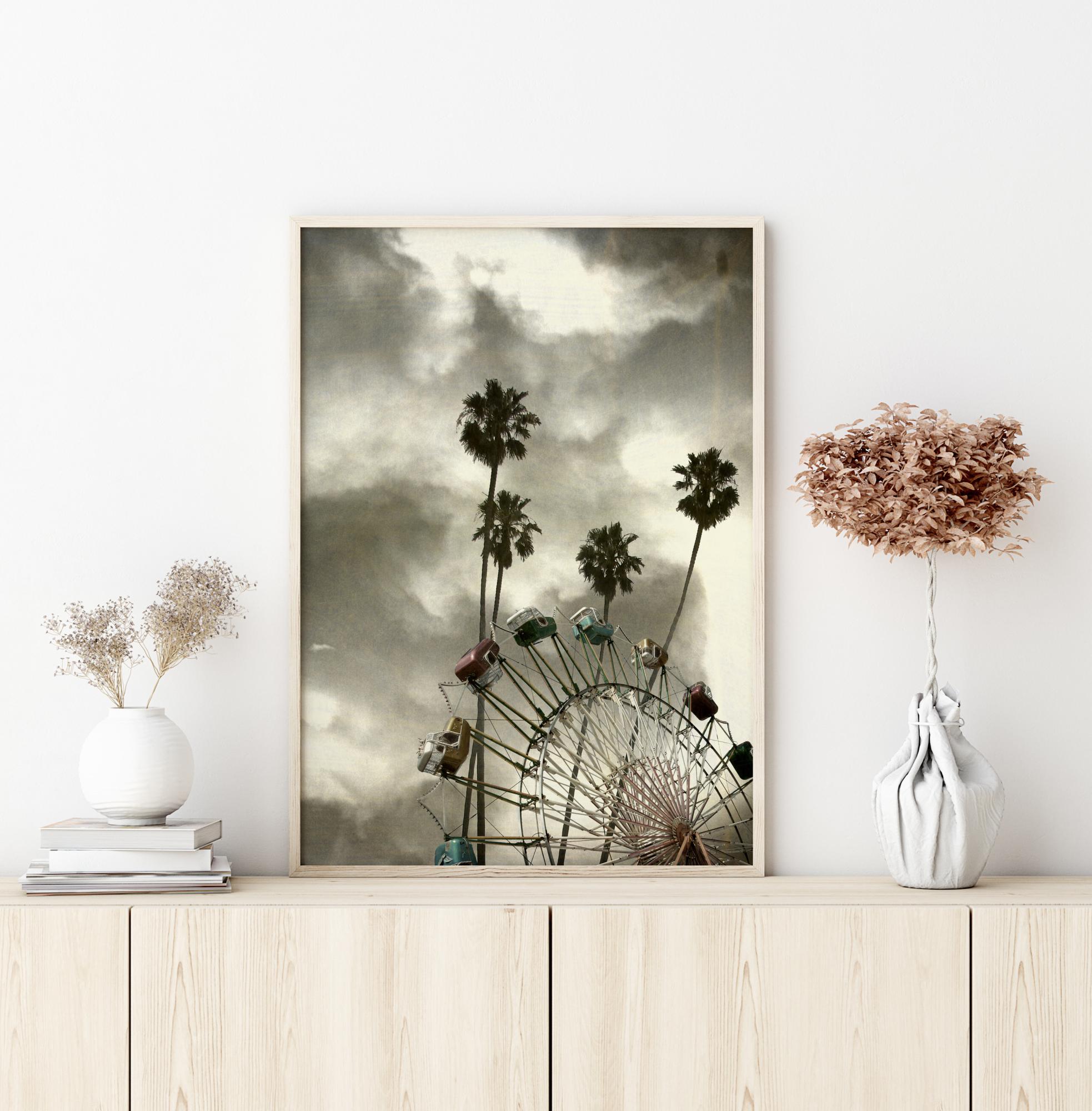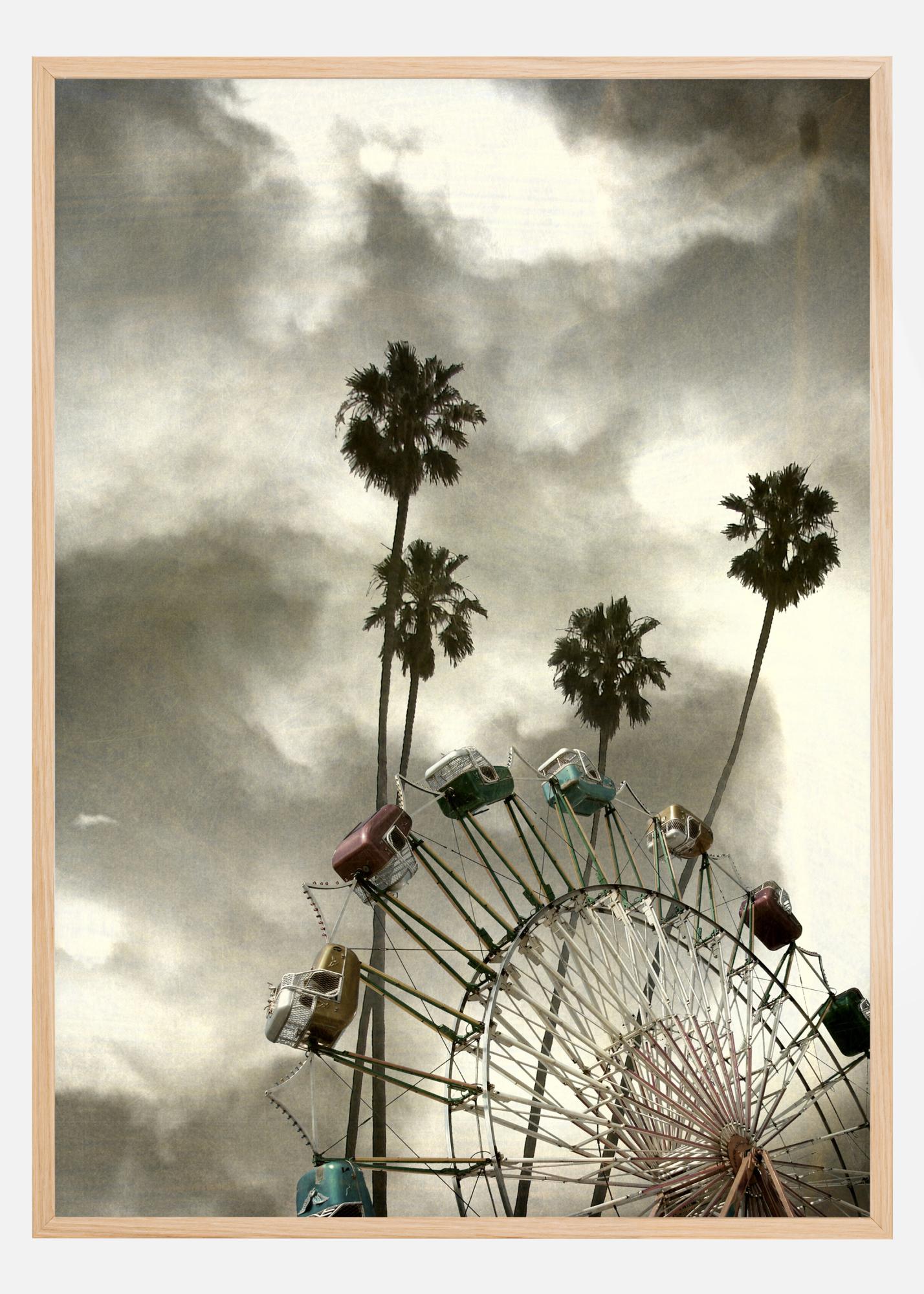 Fotografický plakát zobrazující kolotoč podobný ruskému kolu s vagóny v krásných pastelových barvách na pozadí palem a dramatické oblohy. Krásný plakát s mnoha emocemi.