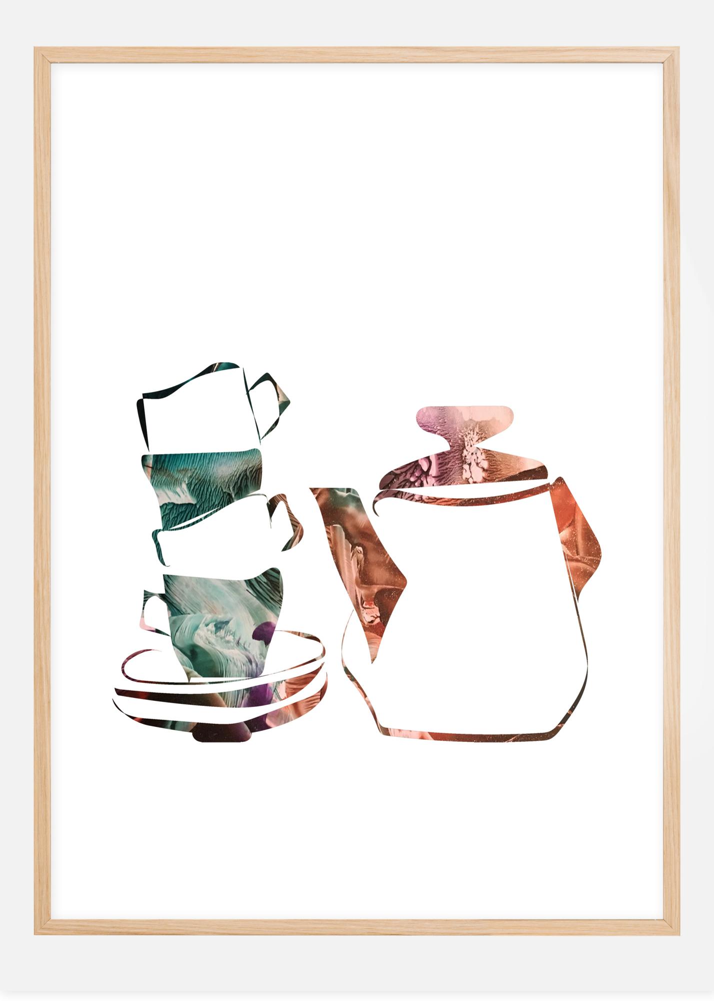 Abstraktní plakát s kávou a čajem a také šálky, podšálky a konvice. Každý je vytvořen z abstraktních mramorovaných polí v tyrkysové a oranžové barvě na bílém pozadí. Připravte se na svůj oblíbený horký nápoj, zatímco se každé ráno díváte na tento obrázek.