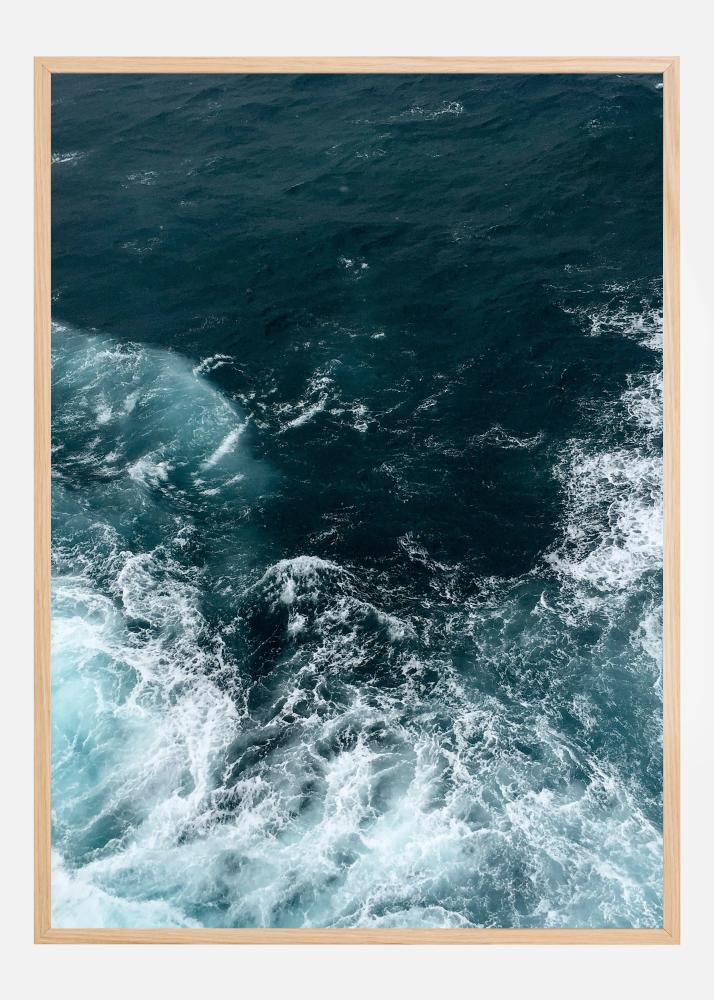 Námořní plakát s vlnami, které narážejí a víří na otevřeném moři. Bílé pěny víří kolem spodního okraje obrazu a vytvářejí klidnější tón tmavé akvamariny. Představte si, že jste na lodi na vlnách s pomocí tohoto úžasného obrazu.