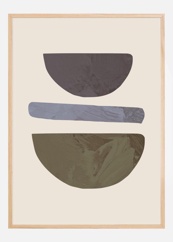 Abstraktní plakát se třemi různými tvary a barvami. Hnědý půlkruh je umístěn dole se světle modrou čarou ve středu obrazu. Nahoře se nachází tmavě šedý půlkruh. Vše na bílém pozadí. Zavěste toto dílo na hladkou stěnu pro nejlepší efekt.
