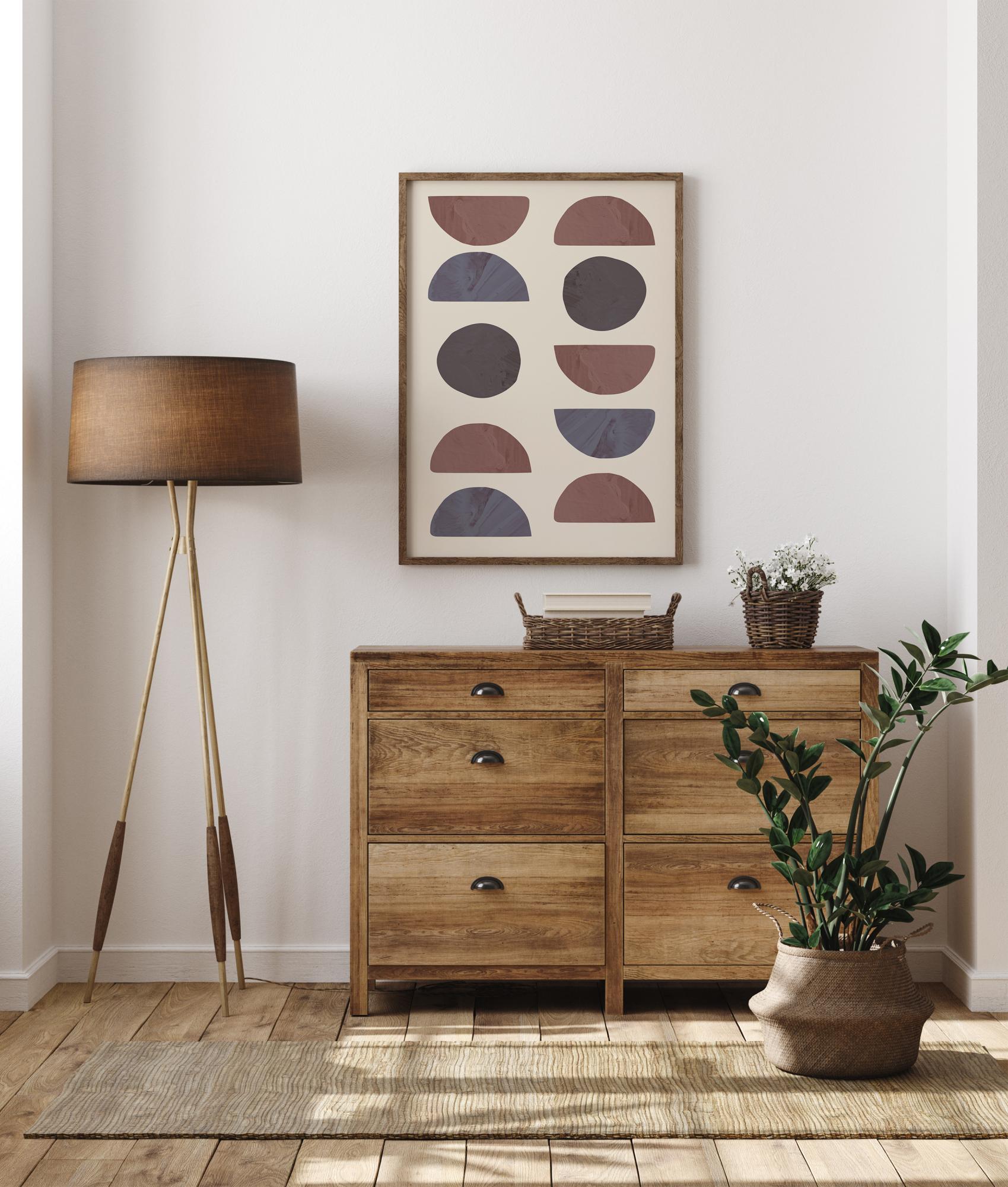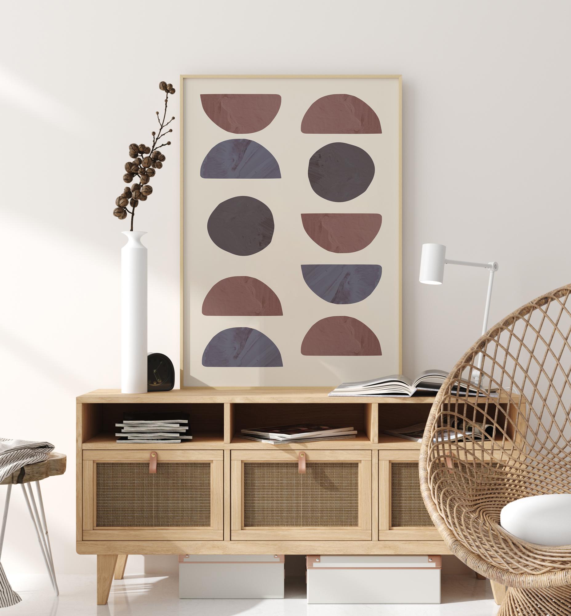 Abstraktní plakát plný různých půlkruhů a kruhových tvarů. Jsou zde dvě řady tvarů s různými vzory kruhů a půlkruhů, vše v různých odstínech modré, šedé a červené. Oživte jednoduchou stěnu v domě těmito geometrickými tvary.