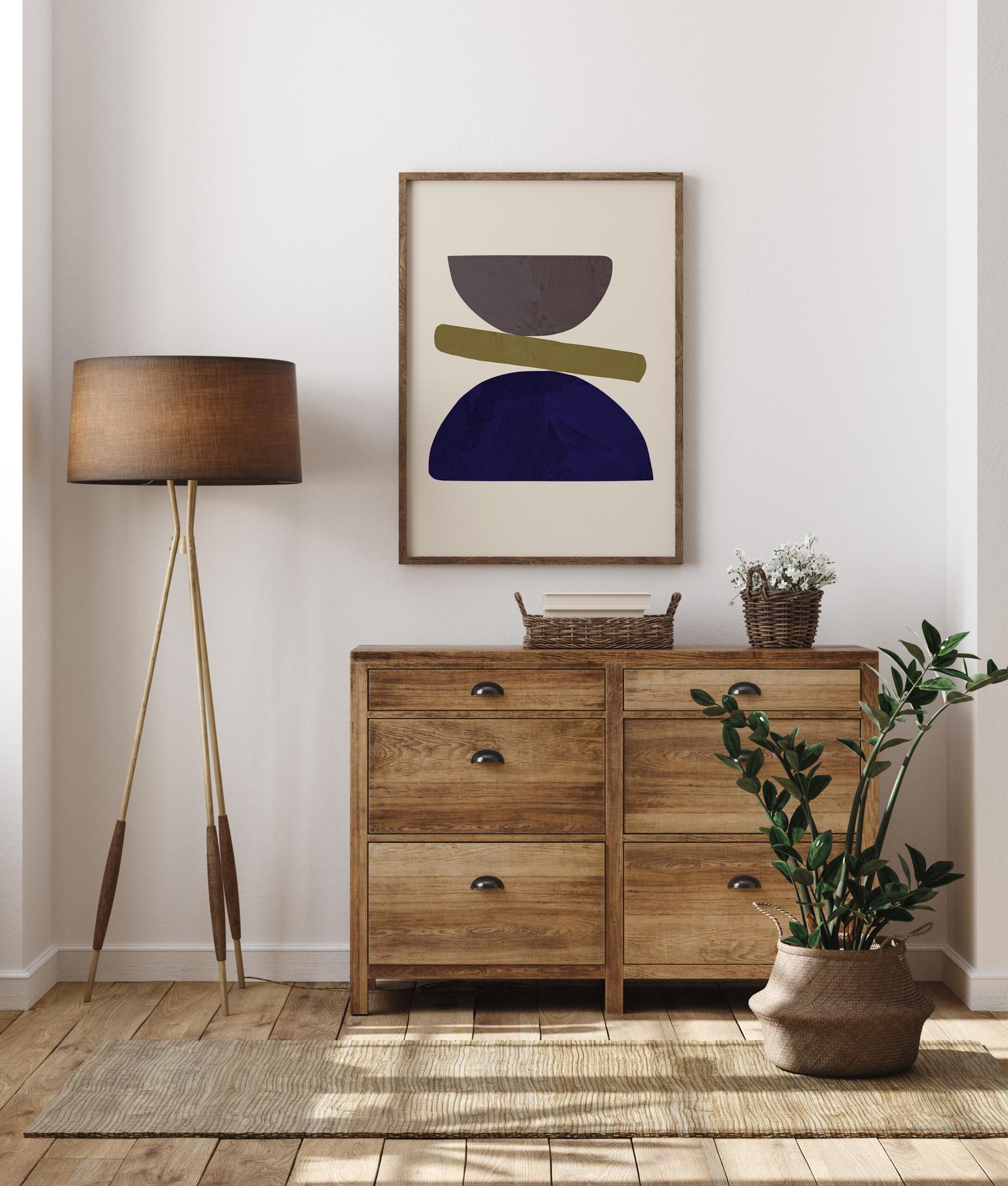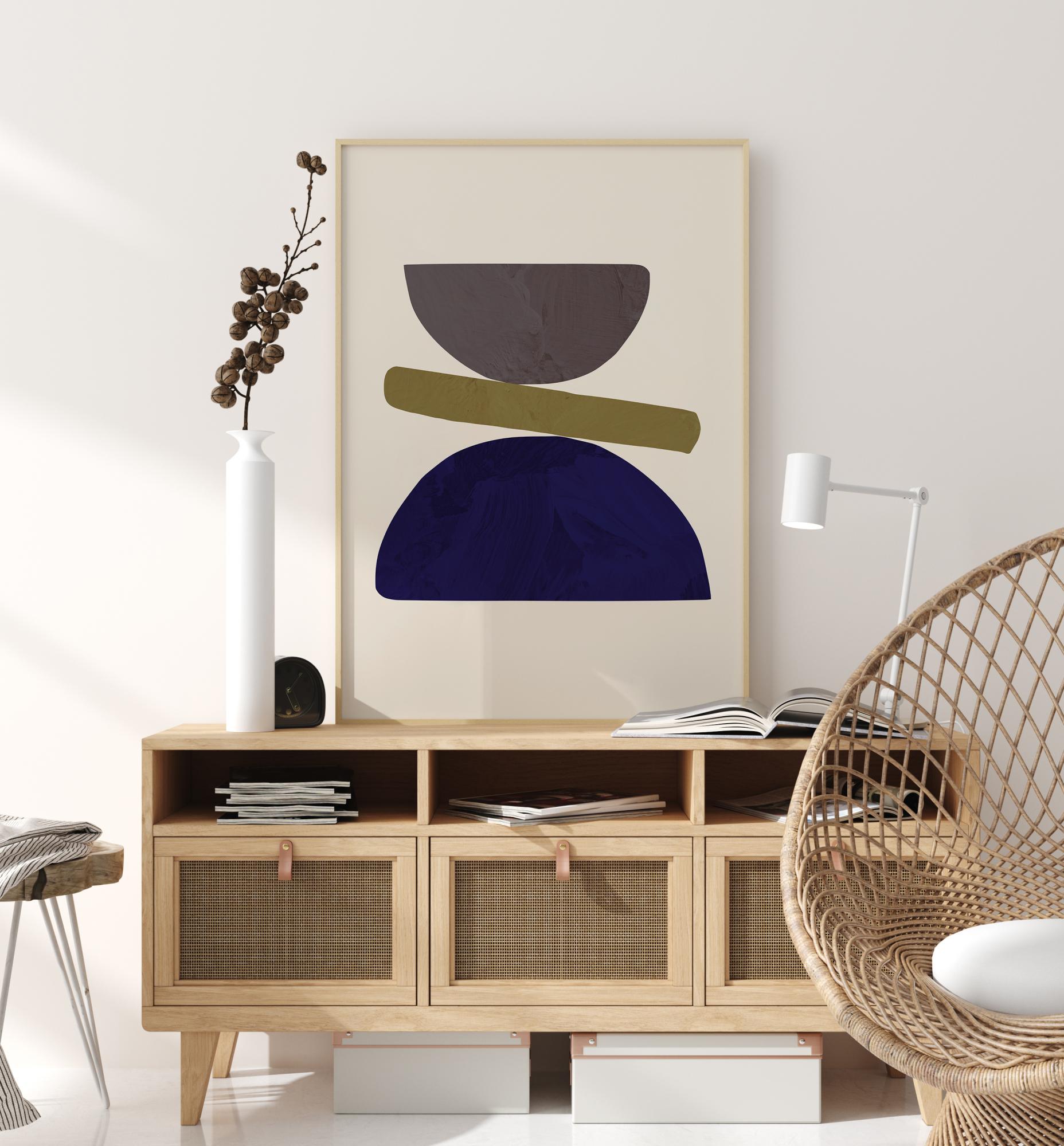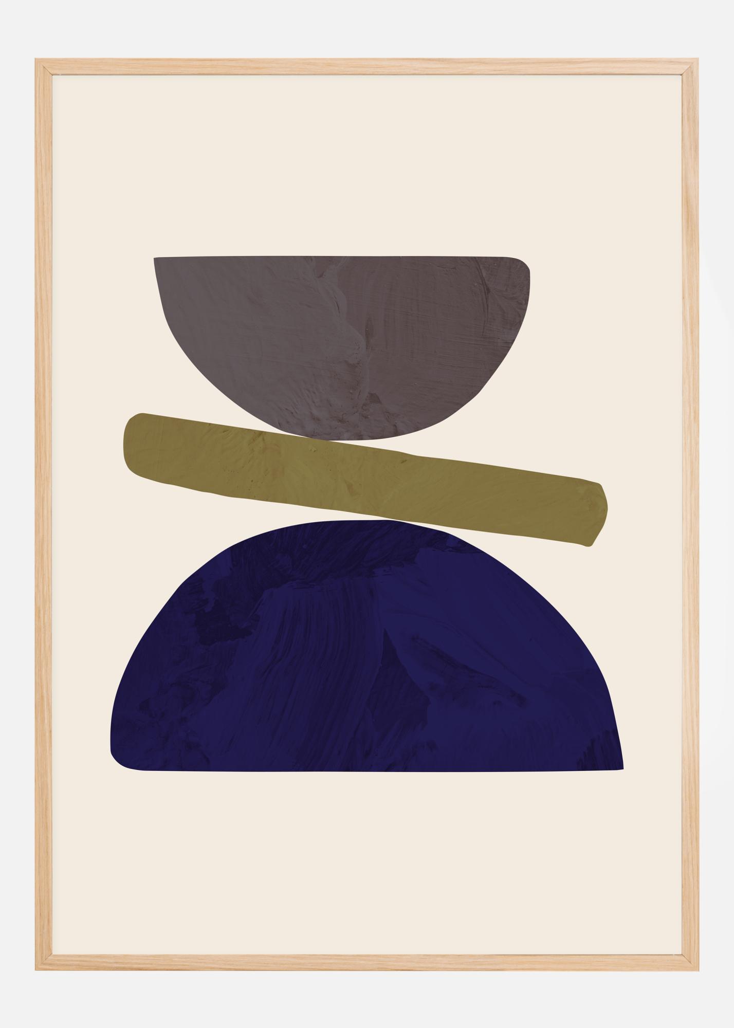 Plakát o rovnováze prostřednictvím geometrie. Velký modrý půlkruh balancuje tenký zelený podlouhlý tvar na své křivce. Navíc šedé půlkruhy vytvářejí přesýpací hodiny. Trávit hodiny před tímto dílem a pokusit se najít další tvary v něm.