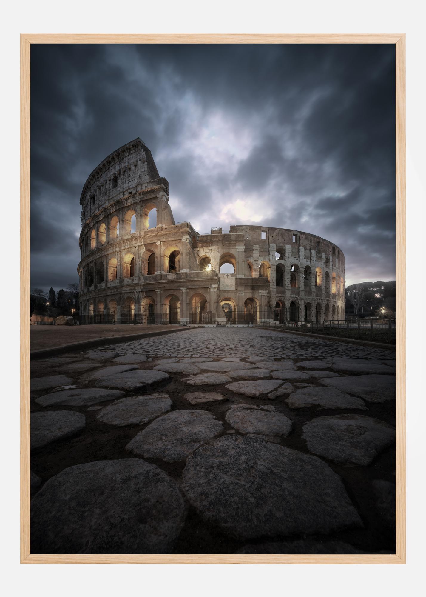 Tento dramatický plakát zachycuje podstatu historického odkazu s působivým obrazem Kolosea v Římě pod intenzivně zamračenou oblohou. Hloubky šedých a modrých tónů na obloze ostře kontrastují s teplým osvětlením, které zvýrazňuje texturu starobylých kamenů. Tento tisk nabízí pohled na antickou architekturu a design, které zastavují čas svou nadčasovou krásou.