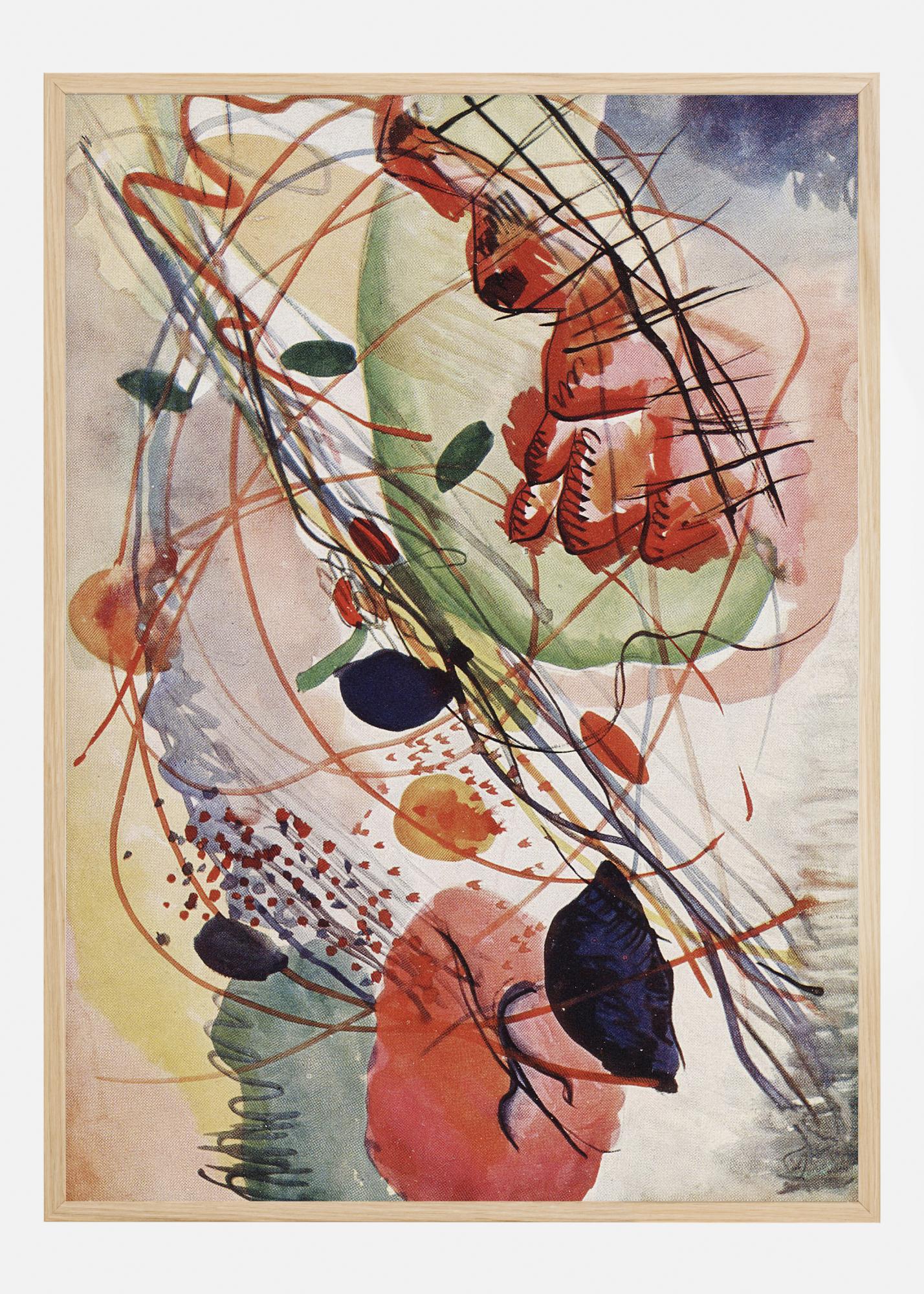 Živý plakát plný abstraktních barev a tvarů, které vytvářejí dramatický, téměř chaotický obraz. Velké odstřiky barev, pestrobarevné tečky a pruhované linie dělají z tohoto díla dramatický kousek, když pohled putuje po obrázku, aby objevil, co se děje. Můžete mít pocit dramatičnosti, když toto dílo pověsíte do haly.