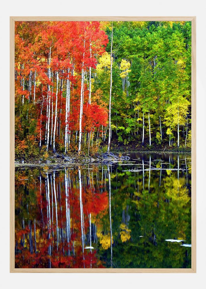 Světelný plakát s jezerem obklopeným stromy. Jaro a podzim se setkávají na tomto barevném obrázku s červenými listy vlevo a zelenými vpravo. Všechny vrhají jasné odrazy na vodu jezera v klidné, ale přesto pestré scéně. Přineste radost z přírody do svého domova pomocí tohoto tisku.