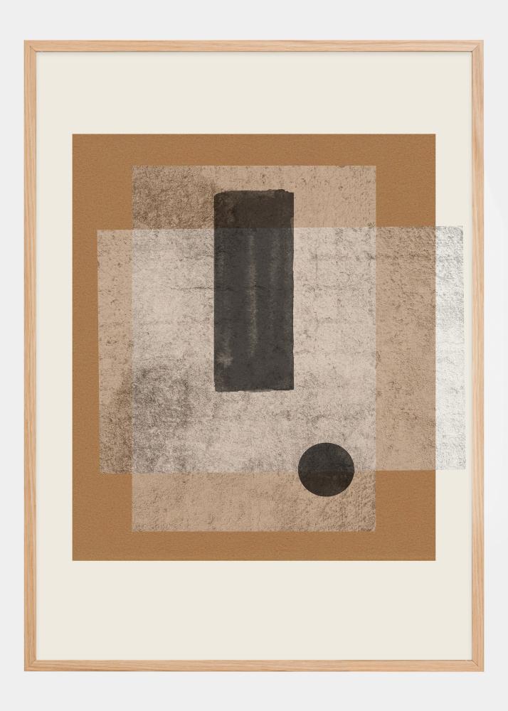Tento plakát je pocta mistrům abstraktního umění, jejichž díla si hrála s tvarem a texturou, aby vytvořila rovnováhu a hloubku. Překrývající se obdélníky v odstínech hnědé, černé a šedé vytvářejí pocit prostoru a rozměru, zatímco osamocený kruh přidává subtilní, ale silnou dynamiku do kompozice.