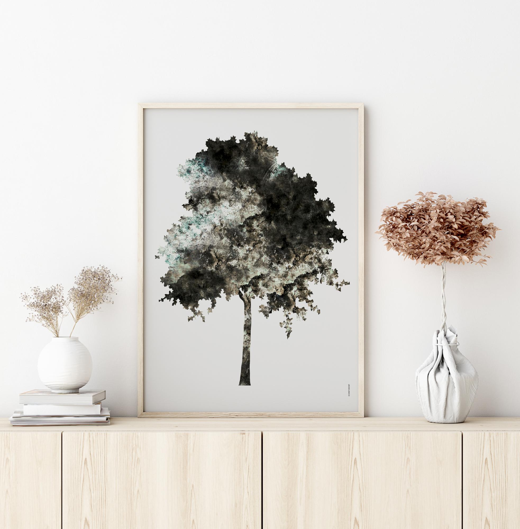 Grafický umělecký plakát ve tvaru stromu, vytvořený grafickou umělkyní Isabell Larsson, VISSLA Visuell Design. Krásně minimalistický obraz v harmonických barvách, který se hodí stejně dobře do předsíně nebo kuchyně jako do obývacího pokoje, ložnice nebo knihovny.